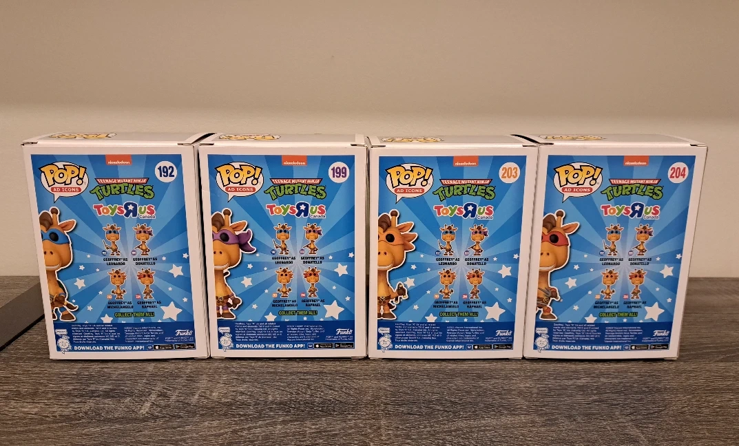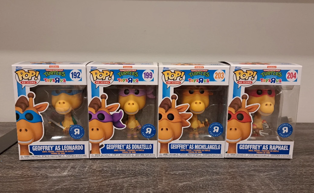 Complete set of ToysRus Geoffrey dressed as Teenage Mutant Ninja Turtles π’ by Funko Pop. #Funko Pop! #FunkoPOP #ToysRus #TMNT #TeenageMutantNinjaTurtles