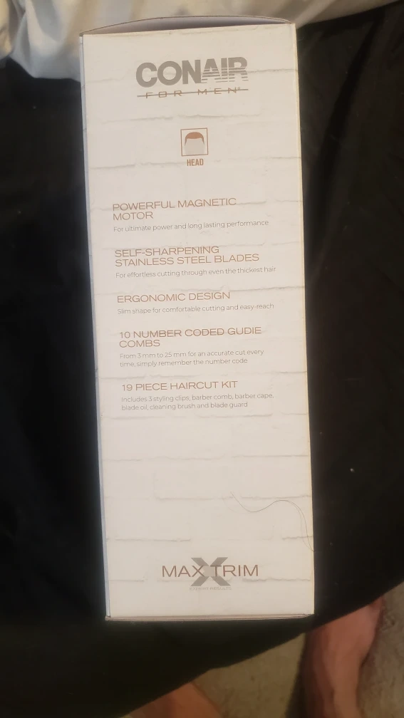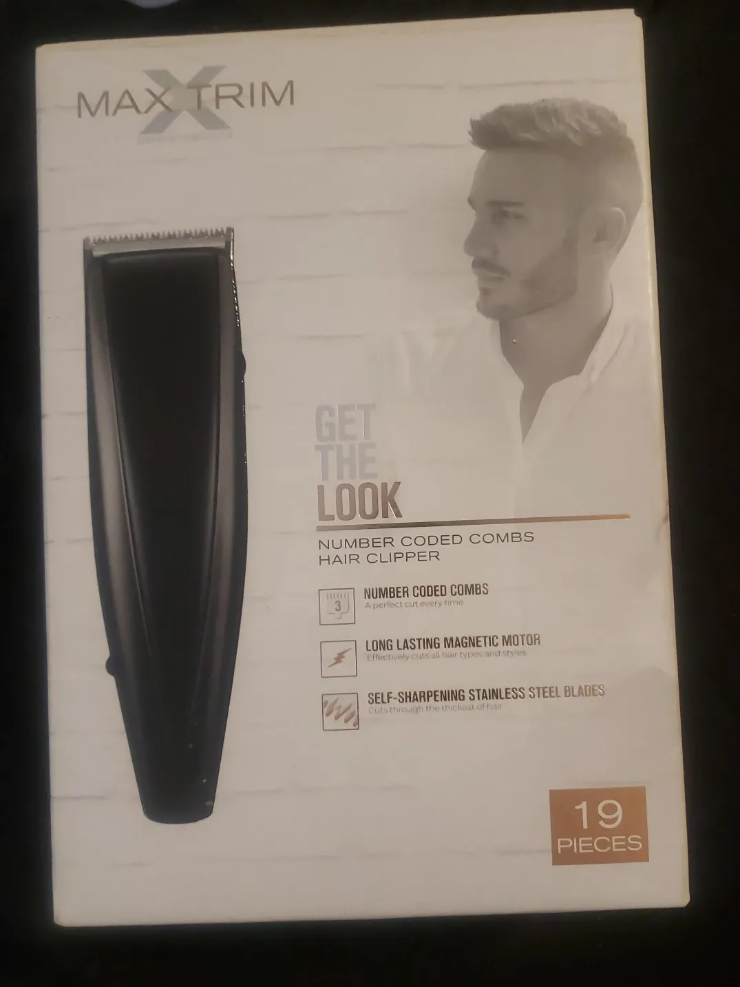 Looking to sell this MAX Trim hair clipper set by Conair. It comes with 19 pieces, including styling clips, barber comb, barber cape, blade oil, cleaning brush and blade guard. The clipper features a powerful magnetic motor and self-sharpening stainless steel blades for effortless cutting. It also has number coded guide combs for an accurate cut every time! The box is included