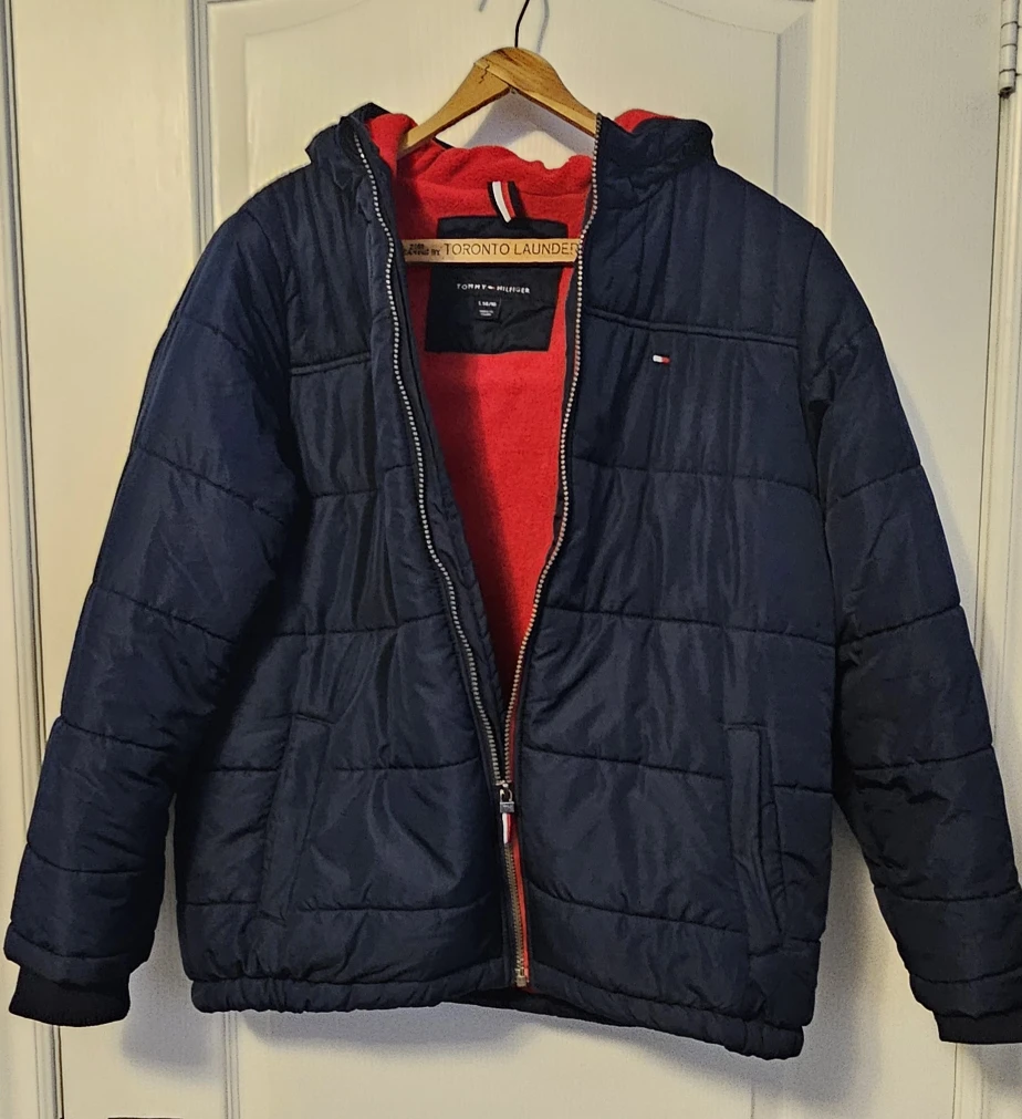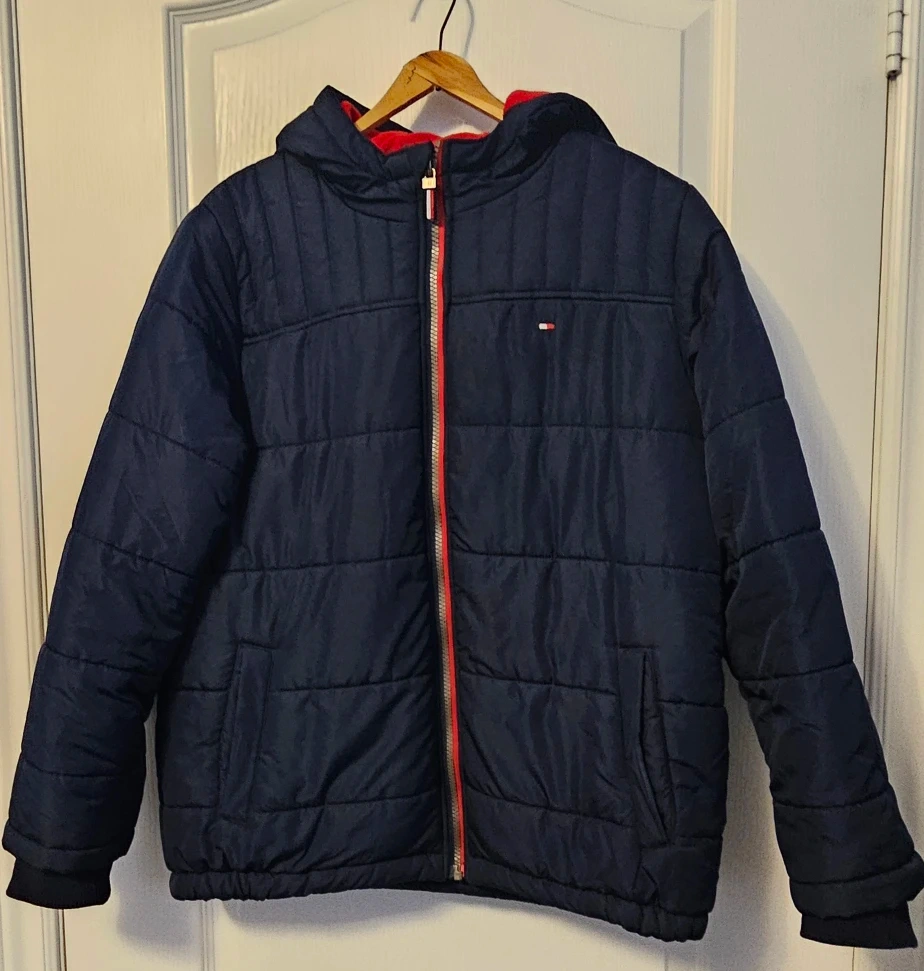 Pre-Owned Tommy Hilfiger Boys puffer jacket in a size large 14/16. It's navy blue with a red Fleece interior and the Tommy Hilfiger logo on the right sleeve. Great for the cooler weather!