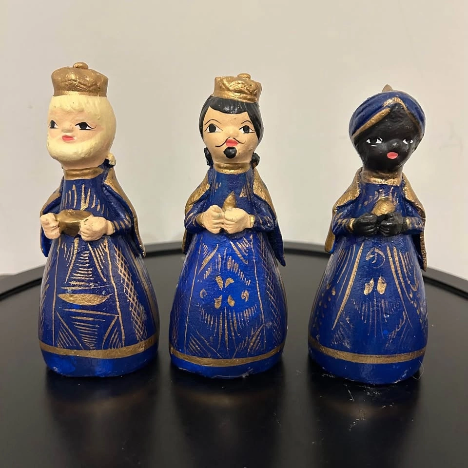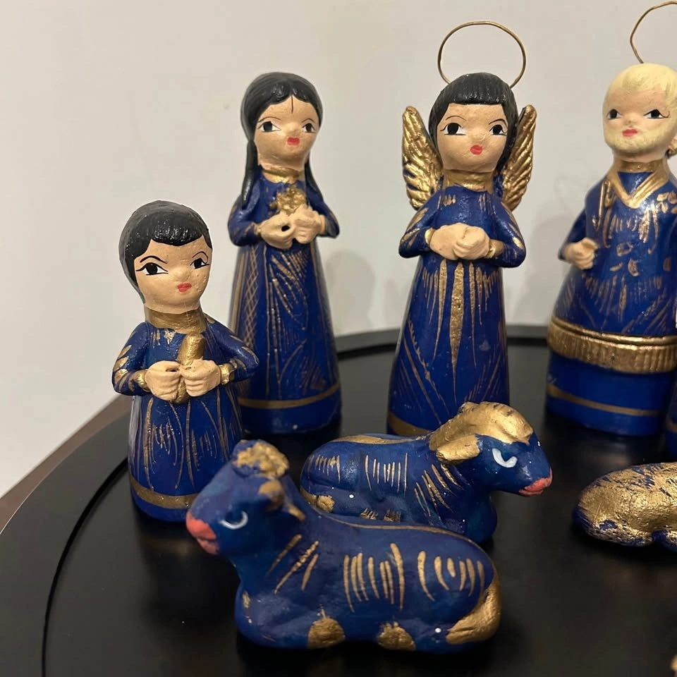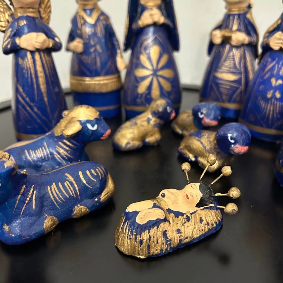 Beautiful vintage hand-crafted Nativity set from Tonalá, Mexico. Made of clay and painted in rich blue and gold tones — a classic Tonalá folk-art palette. Each figure is individually shaped and hand-painted, giving the set a warm artisanal character.