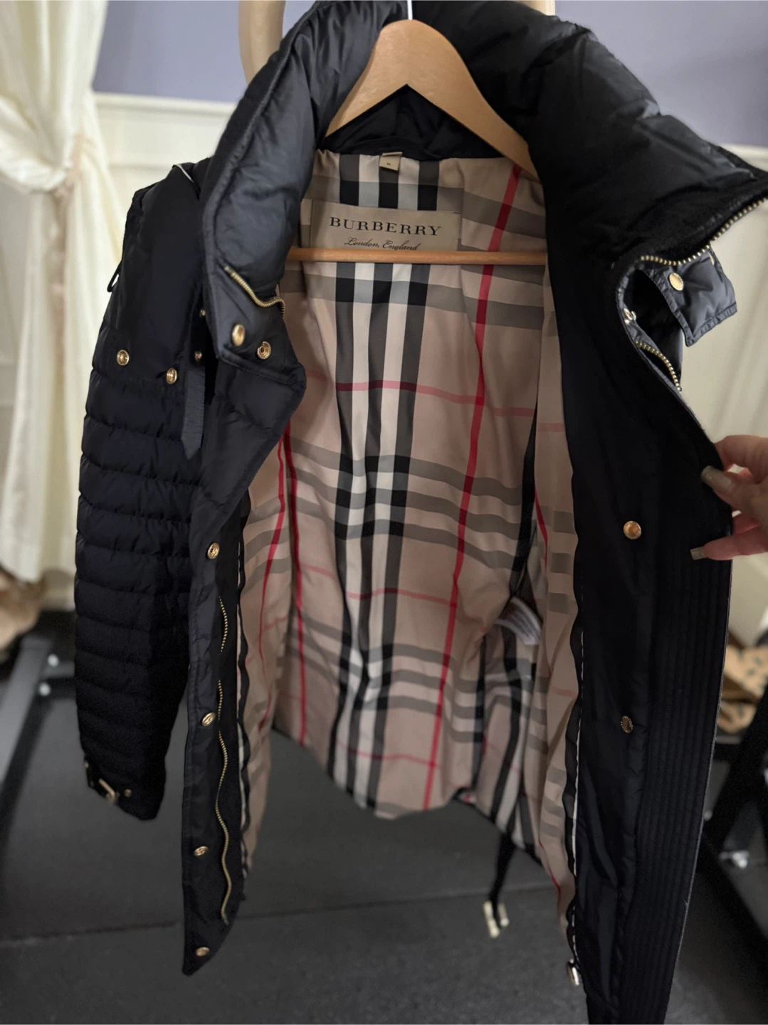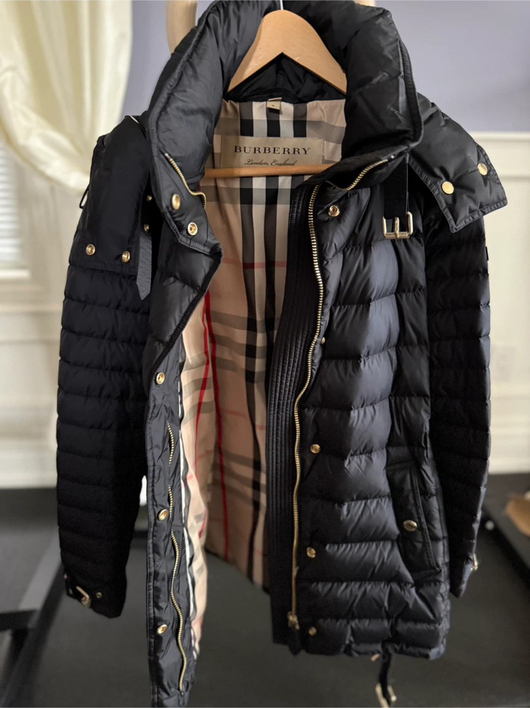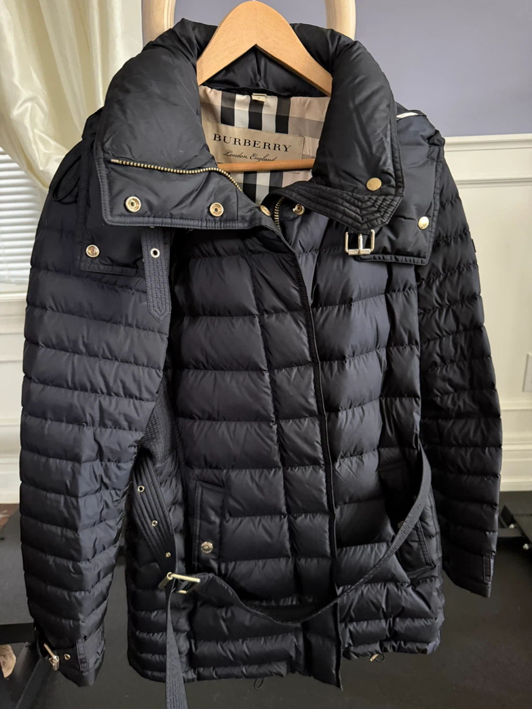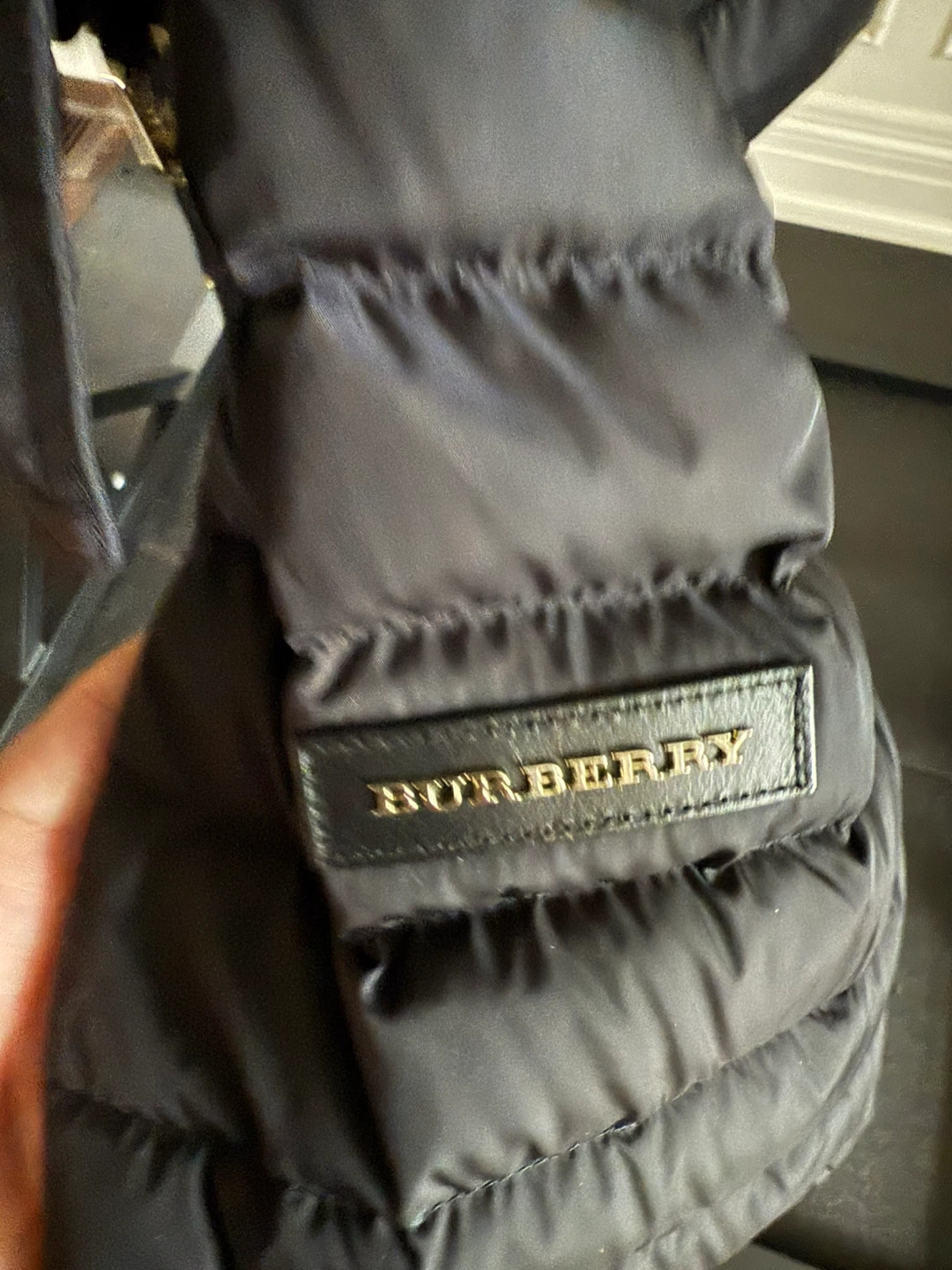 Selling a stylish Burberry London England navy down puffer coat. It features a classic design with gold-tone hardware and the iconic Burberry check lining. Perfect for staying warm and fashionable during the colder months!