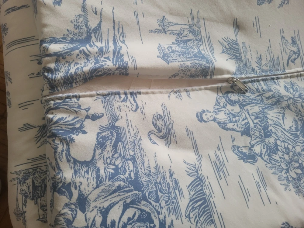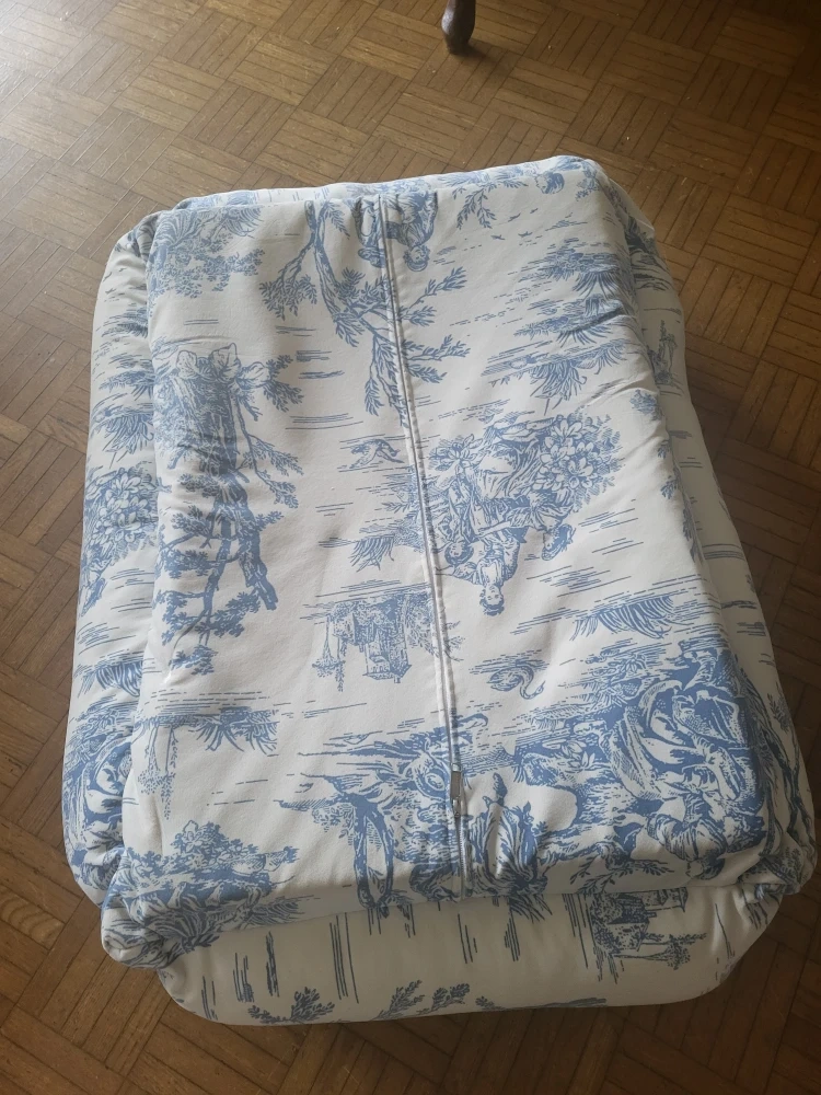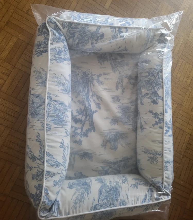This pet bed has a lovely toile print! It's in great condition and ready for a furry friend to enjoy. It has a zipper so you can easily remove the cover for washing.