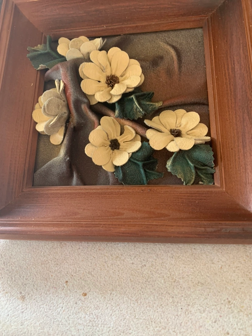 This was a gift I have received from my friend while visiting Europe. / The flowers are cuttings off genuine leather of different colours —Small 25 cm by 25 cm in light brown wooden frame / Very popular in Europe / . —