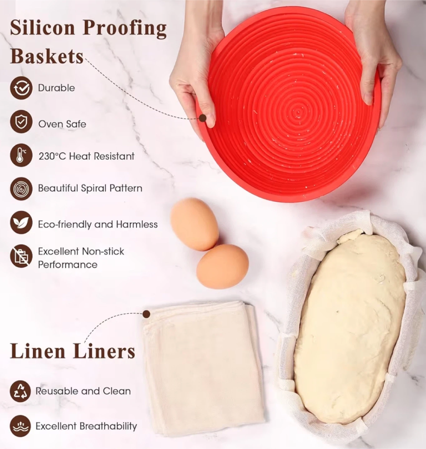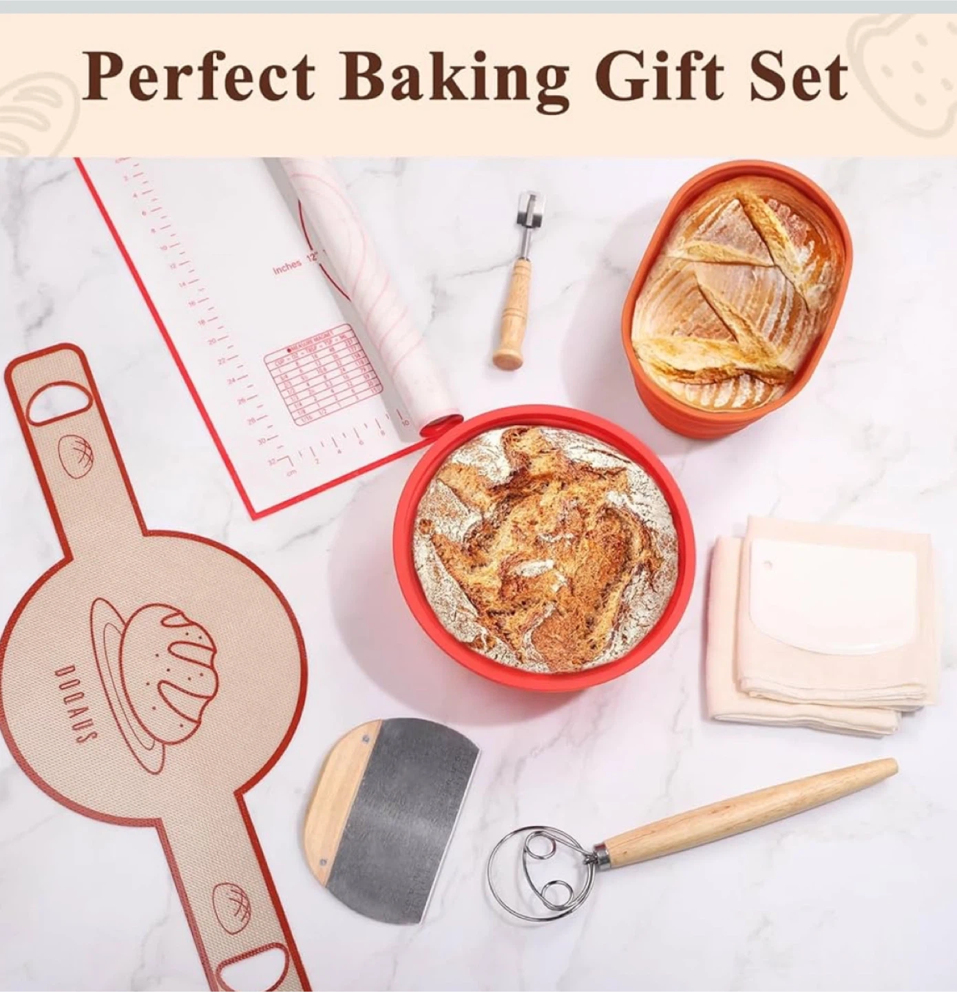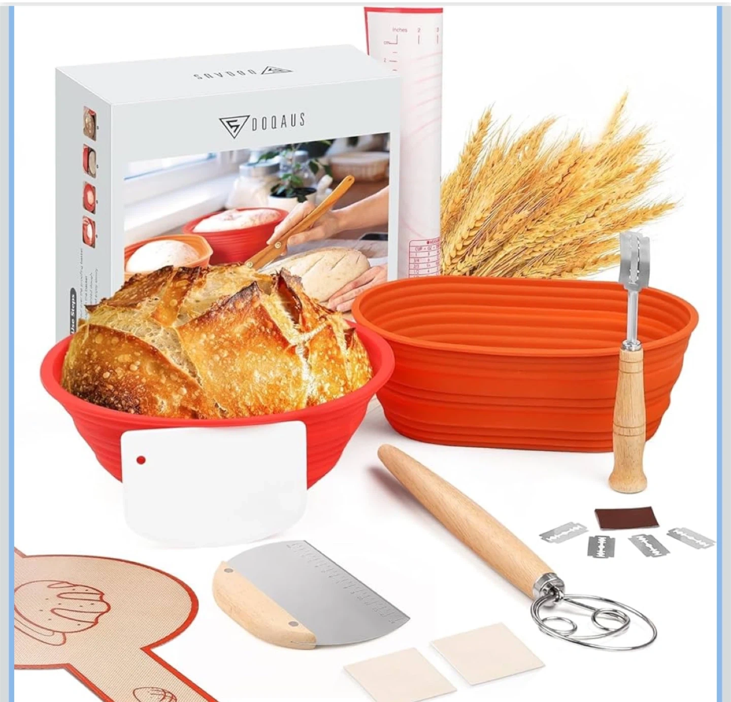 Create perfect loaves with this DOQAUS bread proofing basket set, including round and oval baskets, a dough whisk, a lame, scrapers, and silicone mats for all your baking needs. This set is new and ready to help you bake your best bread yet!