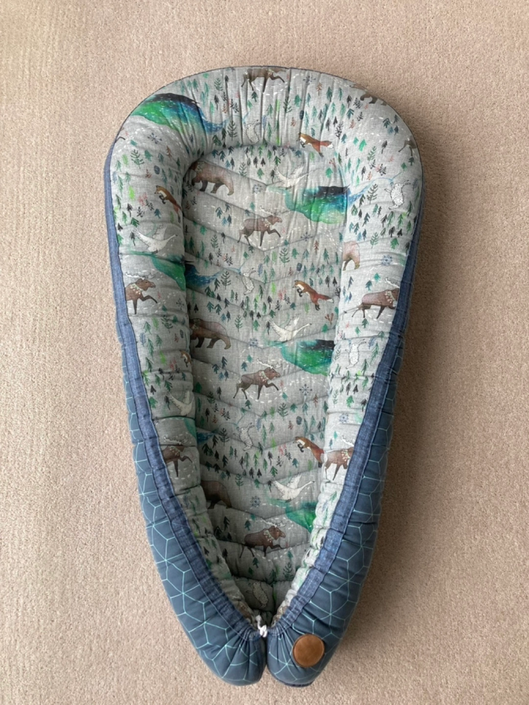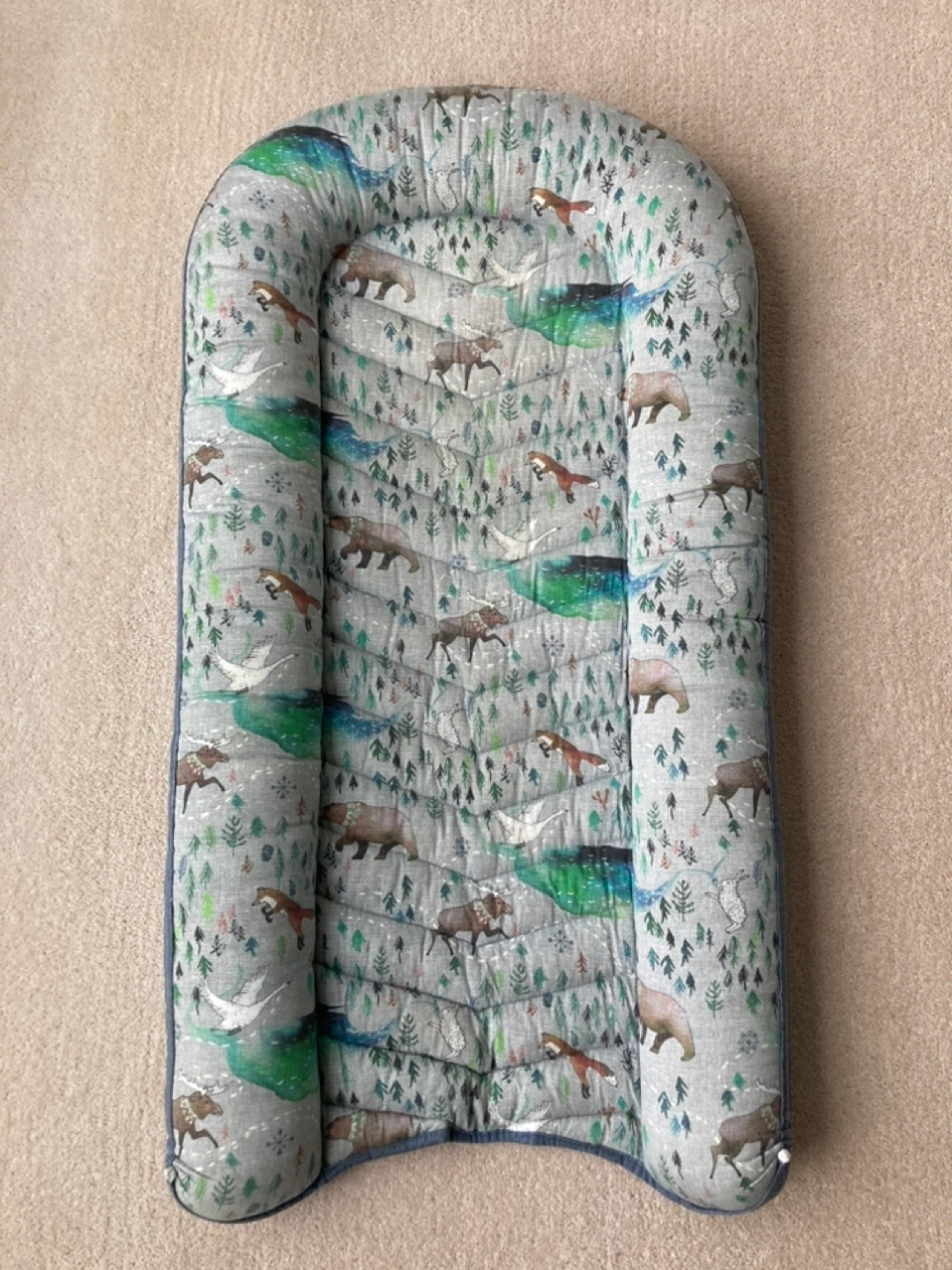 Adorable toddler nest, featuring a soft, quilted design and a woodland animals print. Great for co-sleeping, tummy time or just relaxing. Has been professionally cleaned and ready for its next home. Handmade in BC by Lovebird Sewing NS/NP