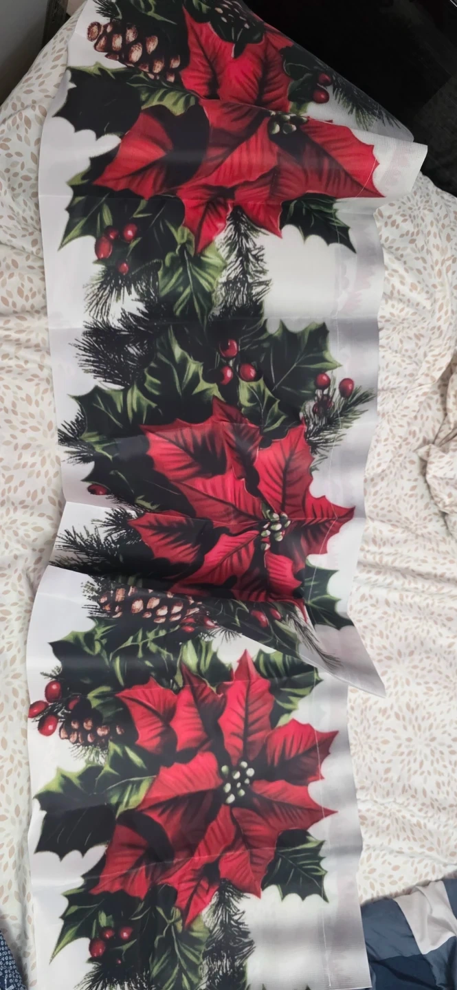 A festive Christmas garland featuring poinsettias, holly, pine branches, and pinecones. It's perfect for adding a touch of holiday cheer to your home! This garland is made of durable material and can be used indoors.