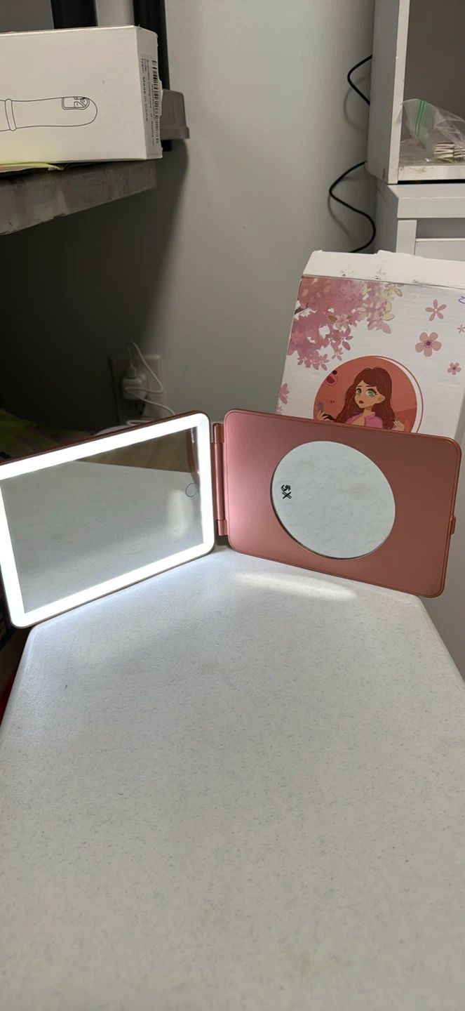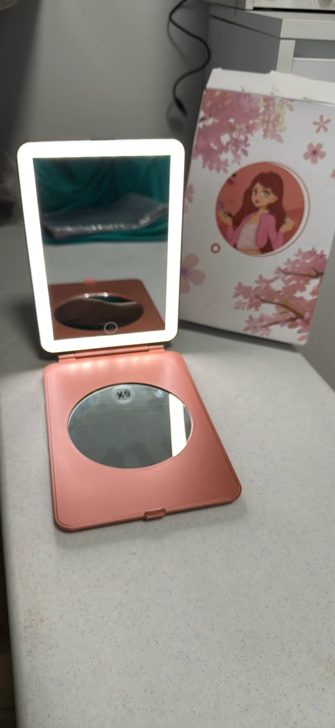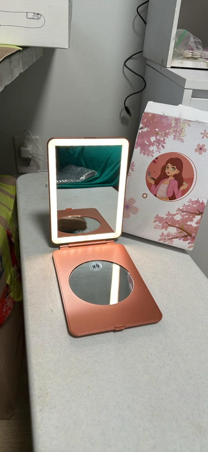 This rose gold foldable makeup mirror features bright LED lights for clear visibility. It includes a secondary magnifying mirror on the inside cover. Comes with a USB charging cable.