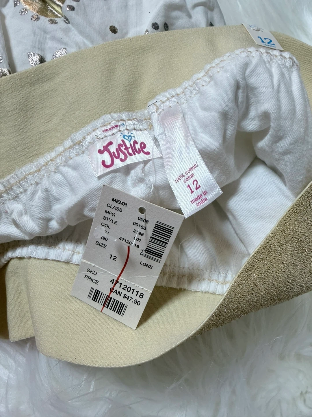 This white skirt from Justice features a sparkly gold floral print with sequin accents. It's a size 12 and made of 100% cotton. The elastic waistband is also detailed with gold shimmer.