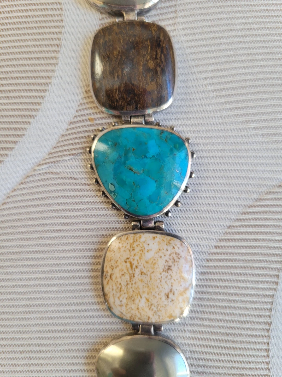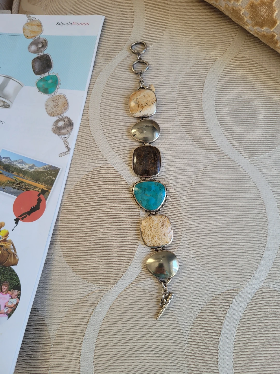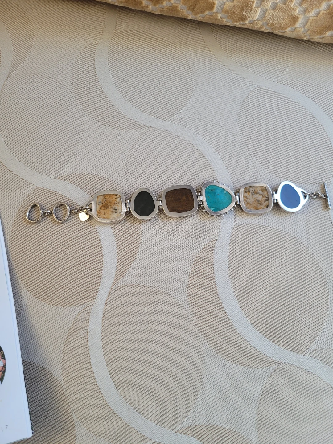 This retired Silpada .925 Sterling Silver bracelet 2011? features a toggle clasp and assorted polished gemstones including Turquoise, Jasper Pyrite, and Bronze. Beautiful crafted detail around the Sterling Silver. I believe it fits upto an 8' wrist