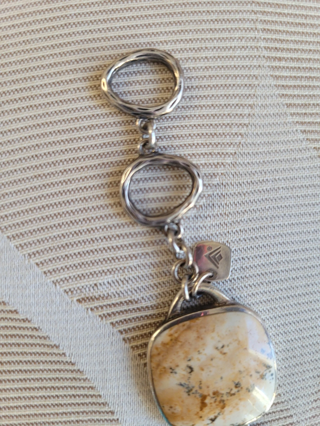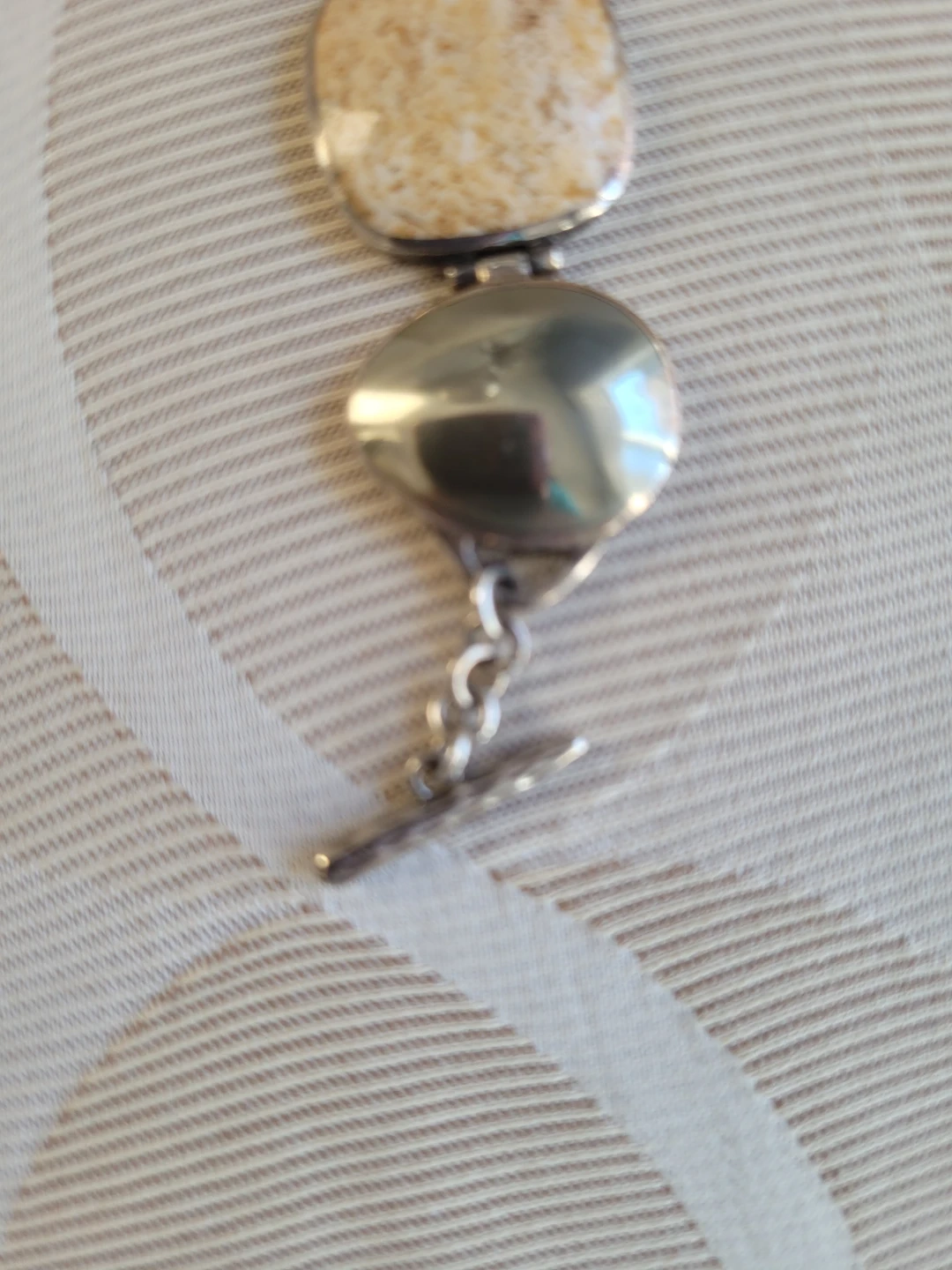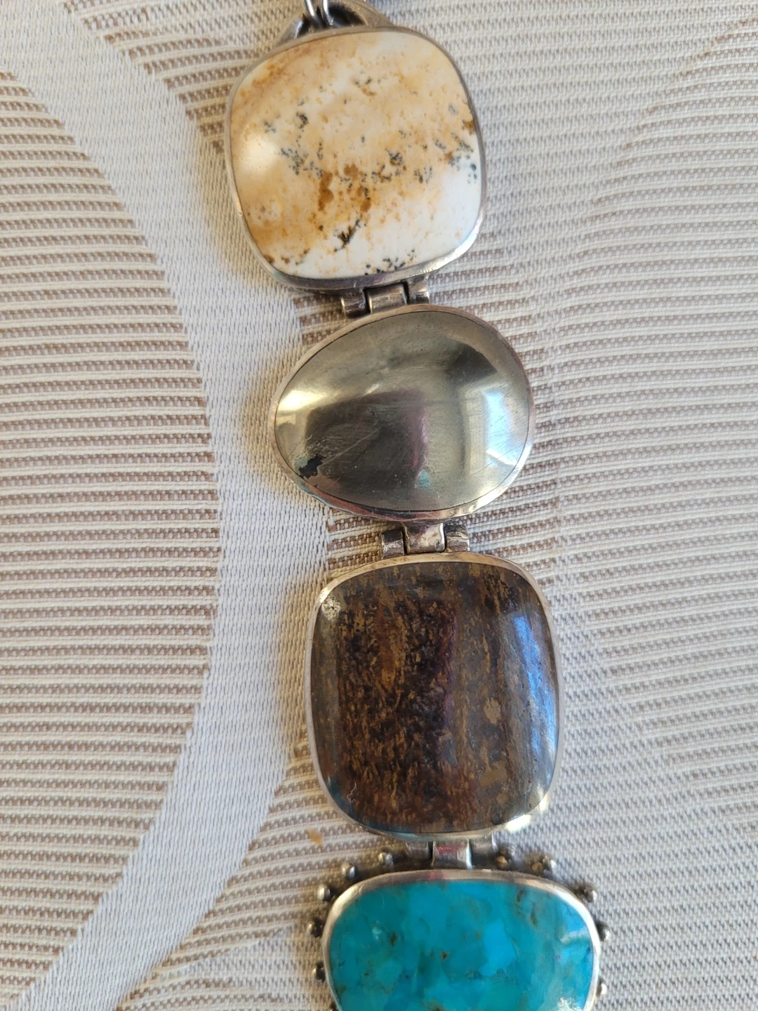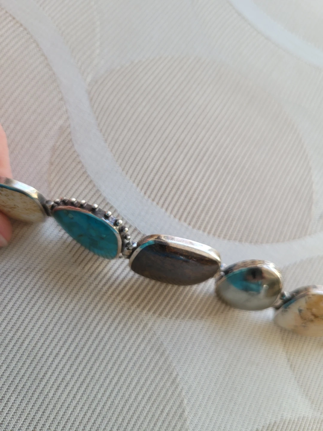 This retired Silpada .925 Sterling Silver bracelet 2011? features a toggle clasp and assorted polished gemstones including Turquoise, Jasper Pyrite, and Bronze. Beautiful crafted detail around the Sterling Silver. I believe it fits upto an 8' wrist