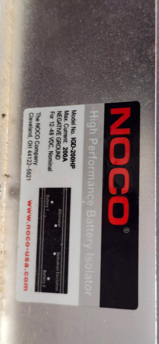 This is a NOCO High Performance Battery Isolator. It's rated for a max current of 200A and is designed for 12-48 VDC nominal systems. It features negative ground. Comes with manual