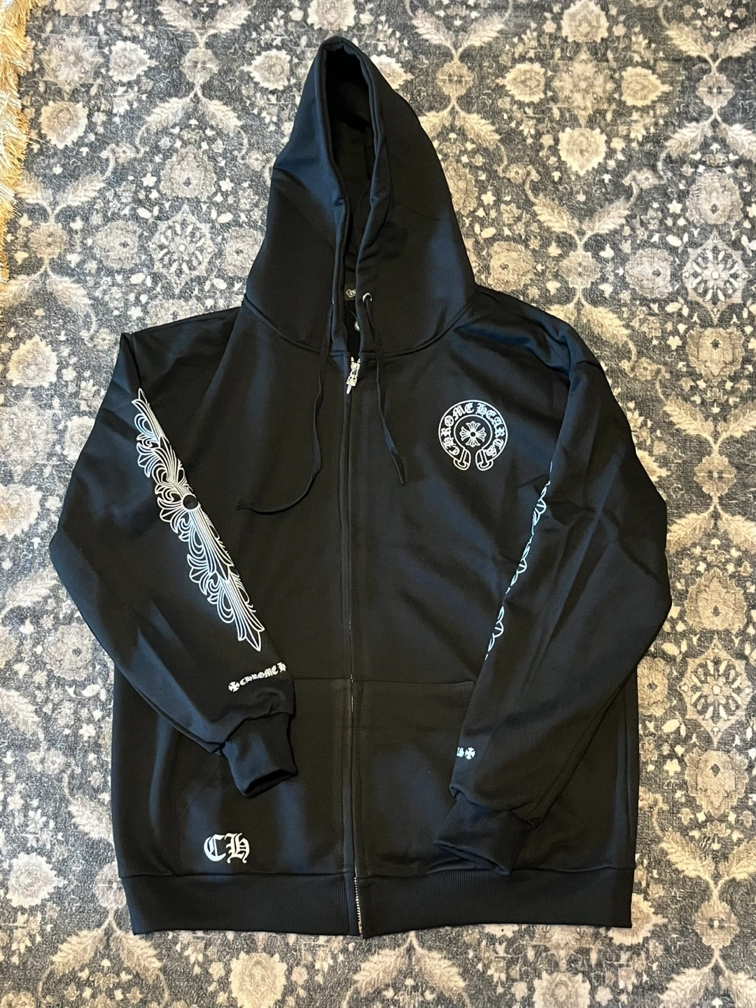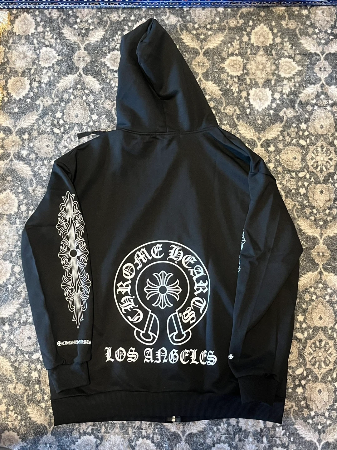 Black zip-up hoodie with Chrome Hearts 'CH' logo and 'Los Angeles' graphic on the back. Features detailed scrollwork and logos on the sleeves. It's made of soft material. This hoodie is a statement piece for streetwear enthusiasts.