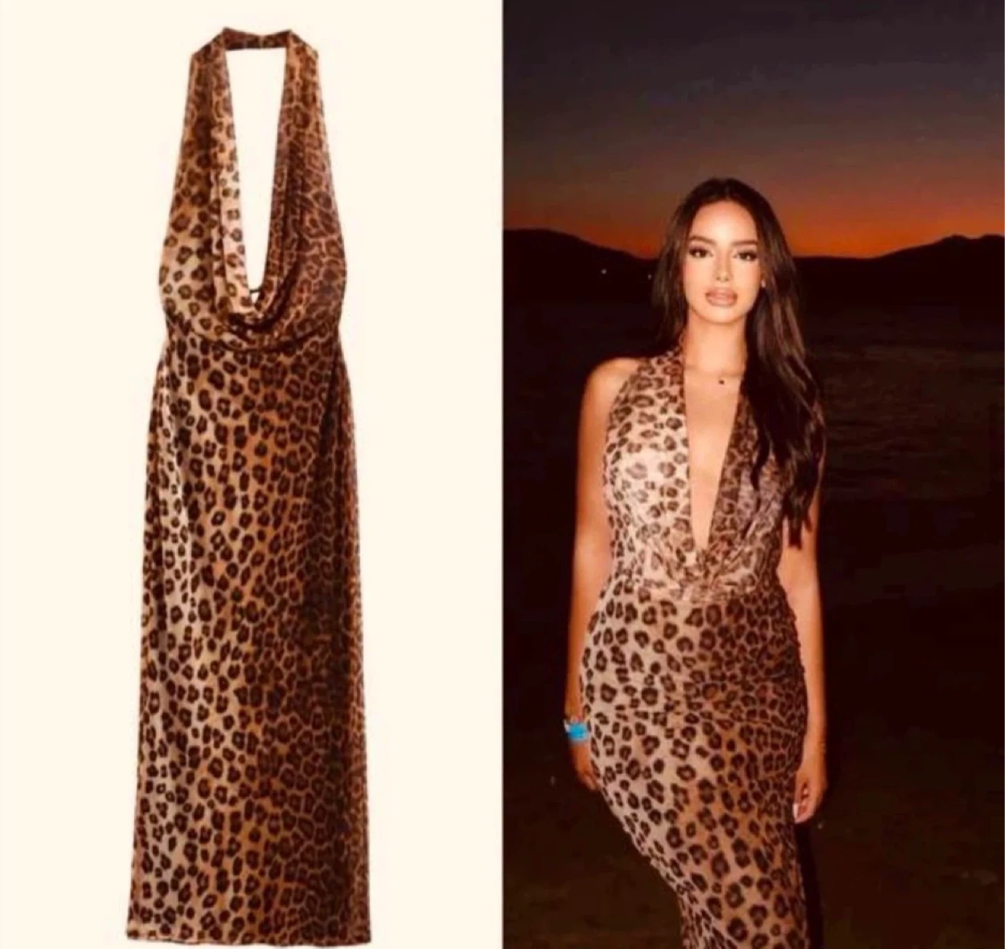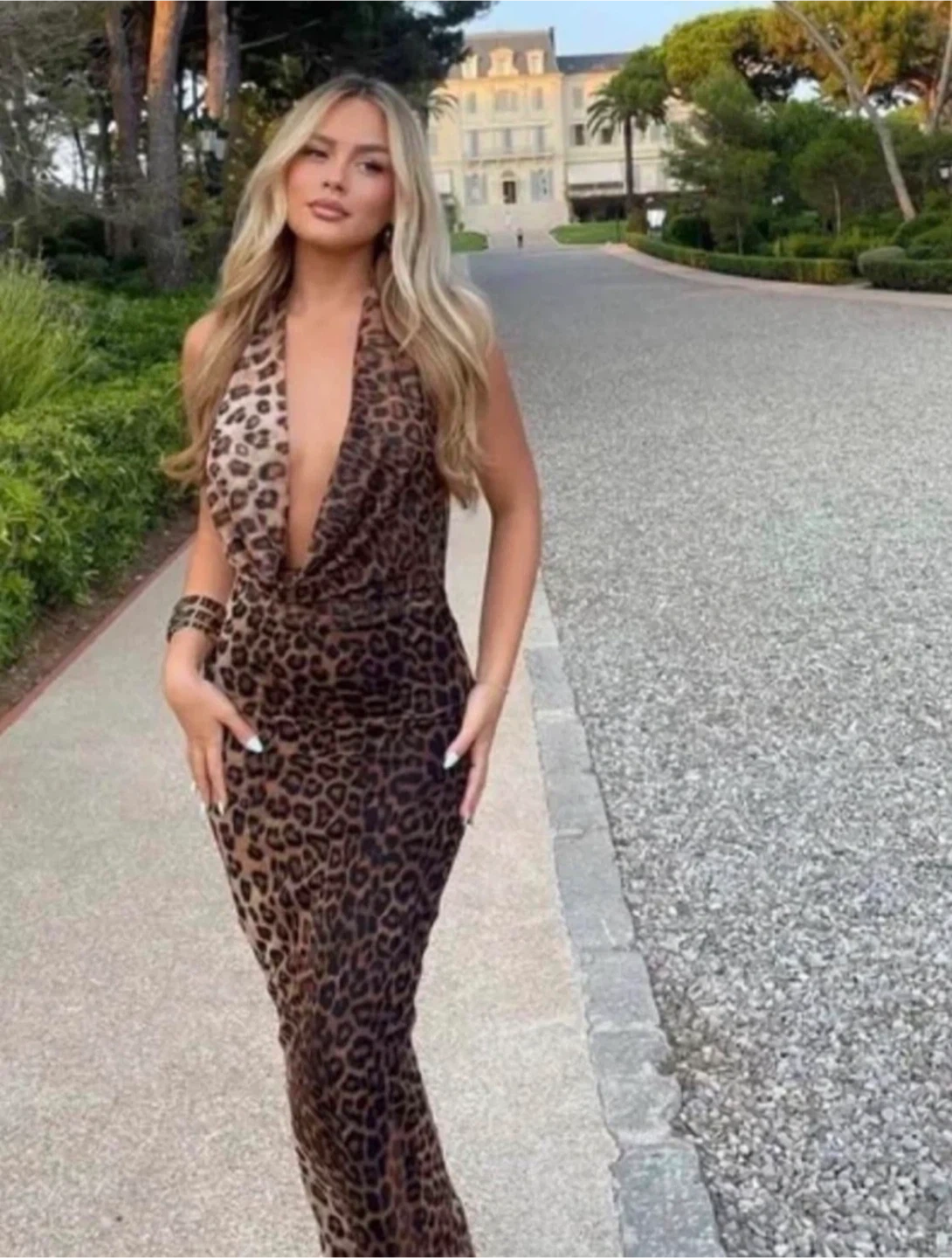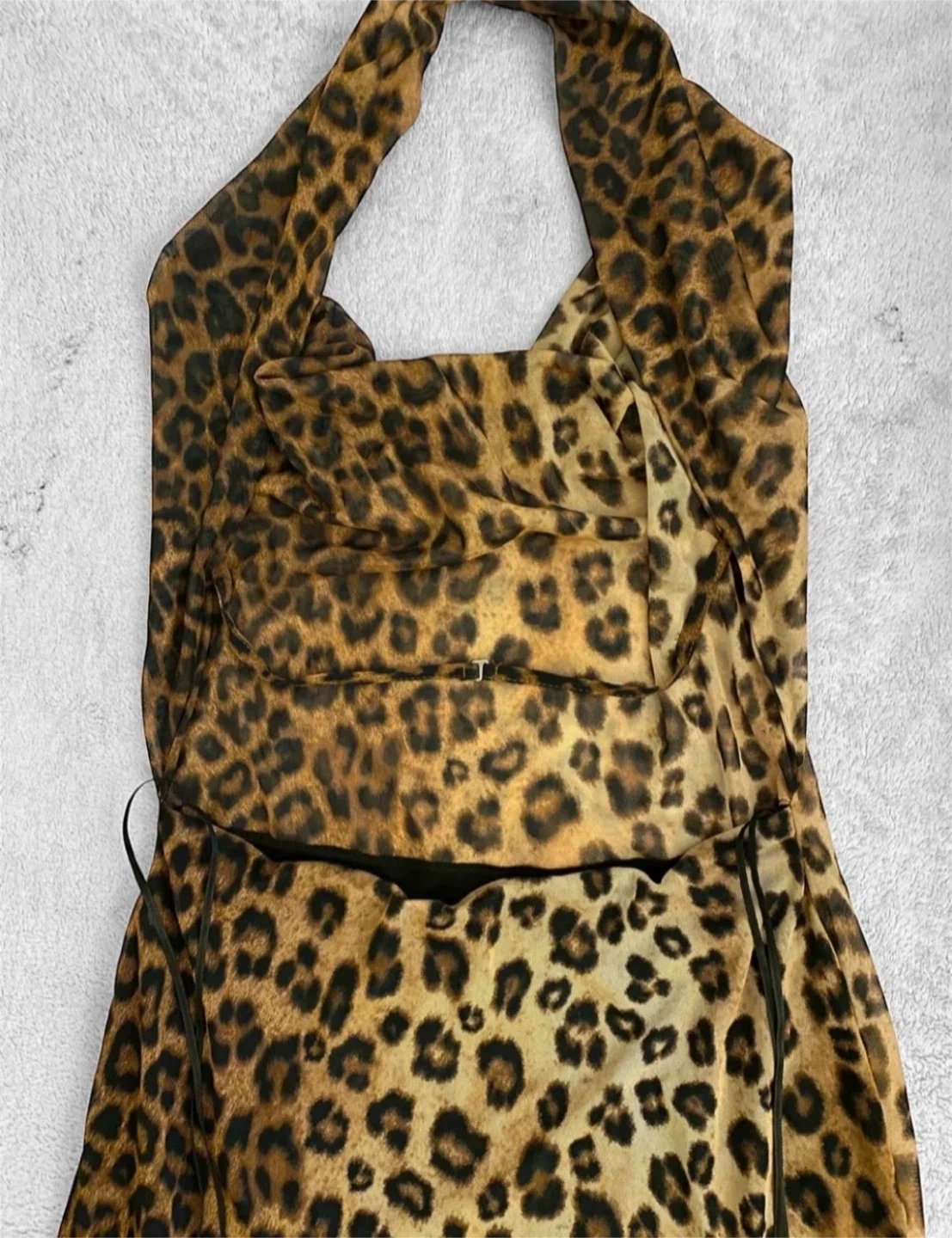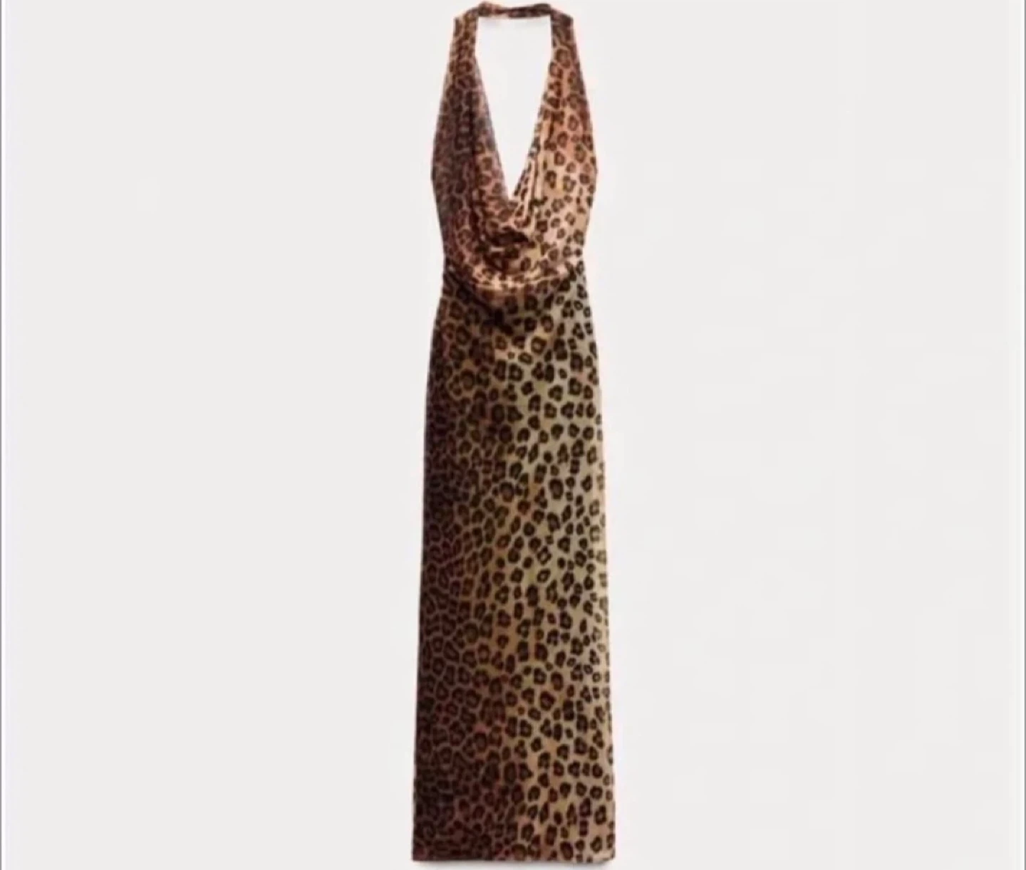Long halter neck dress with plunging neckline and draped detail. Open back with strap and metal hook. Contrasting interior lining.