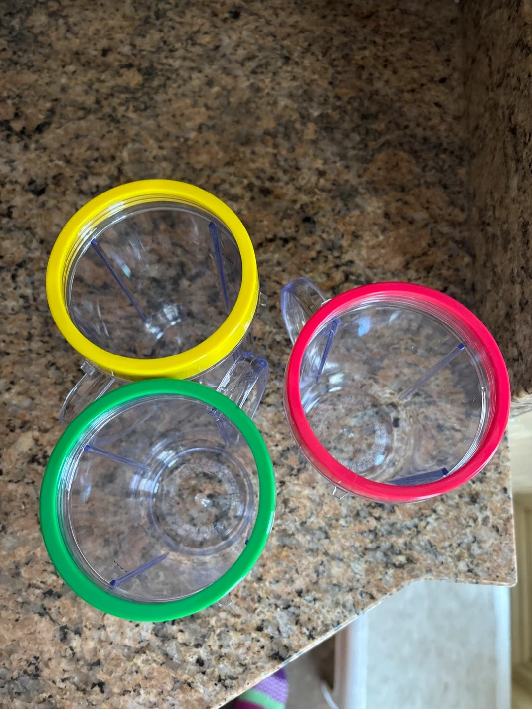 Three plastic blender cups with coloured lids (green, yellow, red). Cups have measurement markings and a handle. They're perfect for making individual smoothies or shakes!