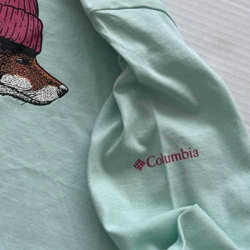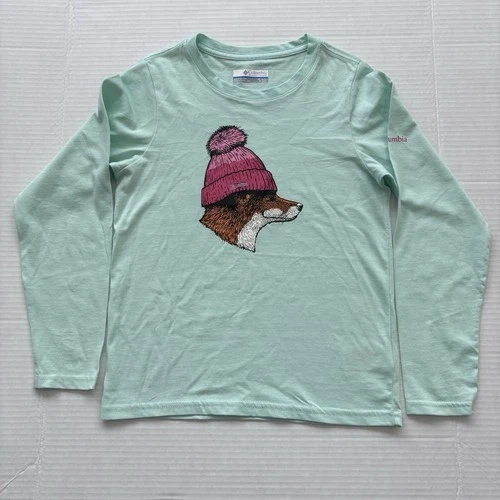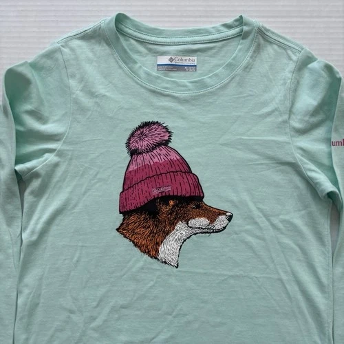Columbia Fox Wearing Beanie T-shirt Girls Size XS Long Sleeve Green Kids Winter