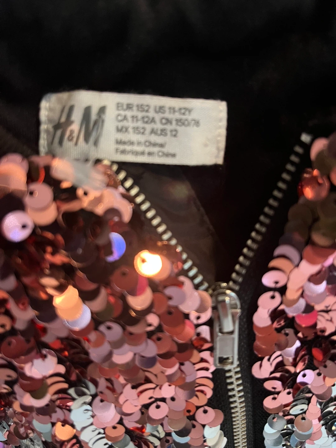 Here's a fun H&M bomber jacket covered in sequins! The size is 11-12 years (US sizing). It's in great condition and ready for a new owner!