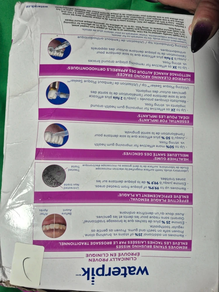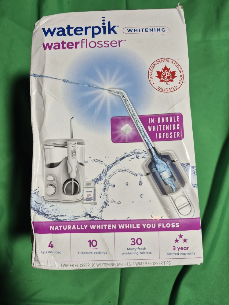 I'm selling a brand new Waterpik Whitening Water Flosser, still in its original box! It comes with 4 tips, 10 pressure settings, and 30 minty fresh whitening tablets. It also has a 3-year limited warranty. This water flosser naturally whitens while you floss with its in-handle whitening infuser. It's a safe and gentle precision whitening solution for removing plaque and reaching those hard-to-get areas between teeth