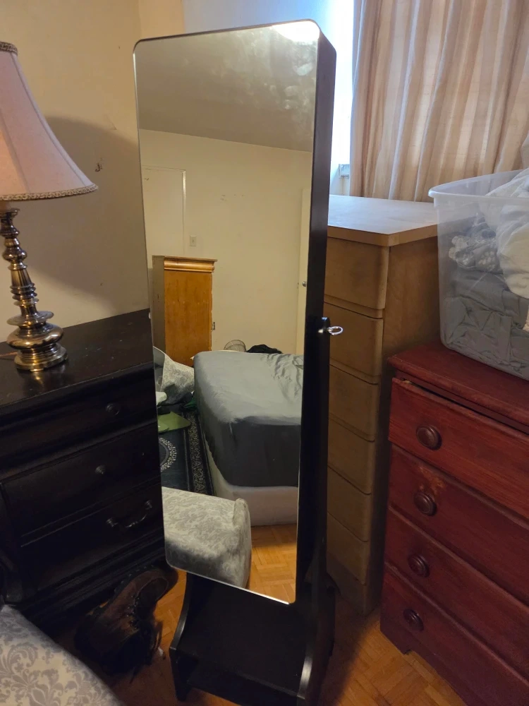 Selling a mirrored jewelry armoire in a dark brown finish. It's in great condition and offers lots of storage for your jewelry and accessories. Perfect for keeping everything organized and easily accessible