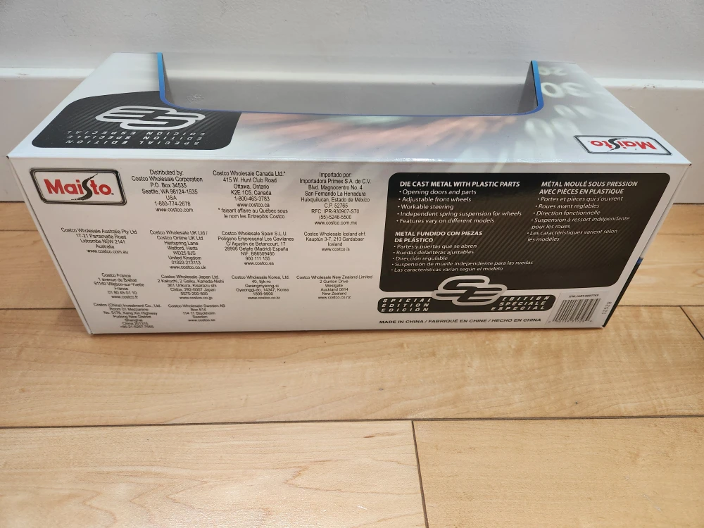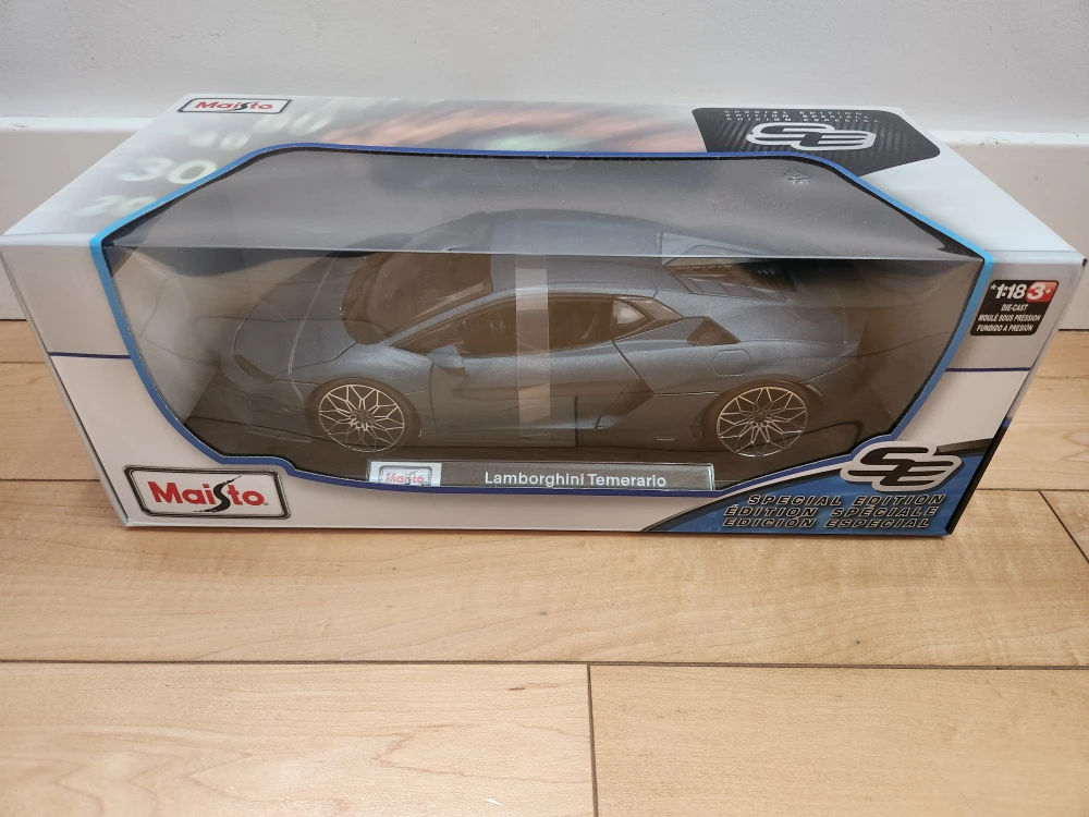 Selling a brand new Maisto Lamborghini Temerario special edition diecast car. It's a 1:18 scale model. The box indicates that it has die-cast metal with plastic parts, opening doors and parts, adjustable front wheels, and workable steering. It also features independent spring suspension for the wheels.