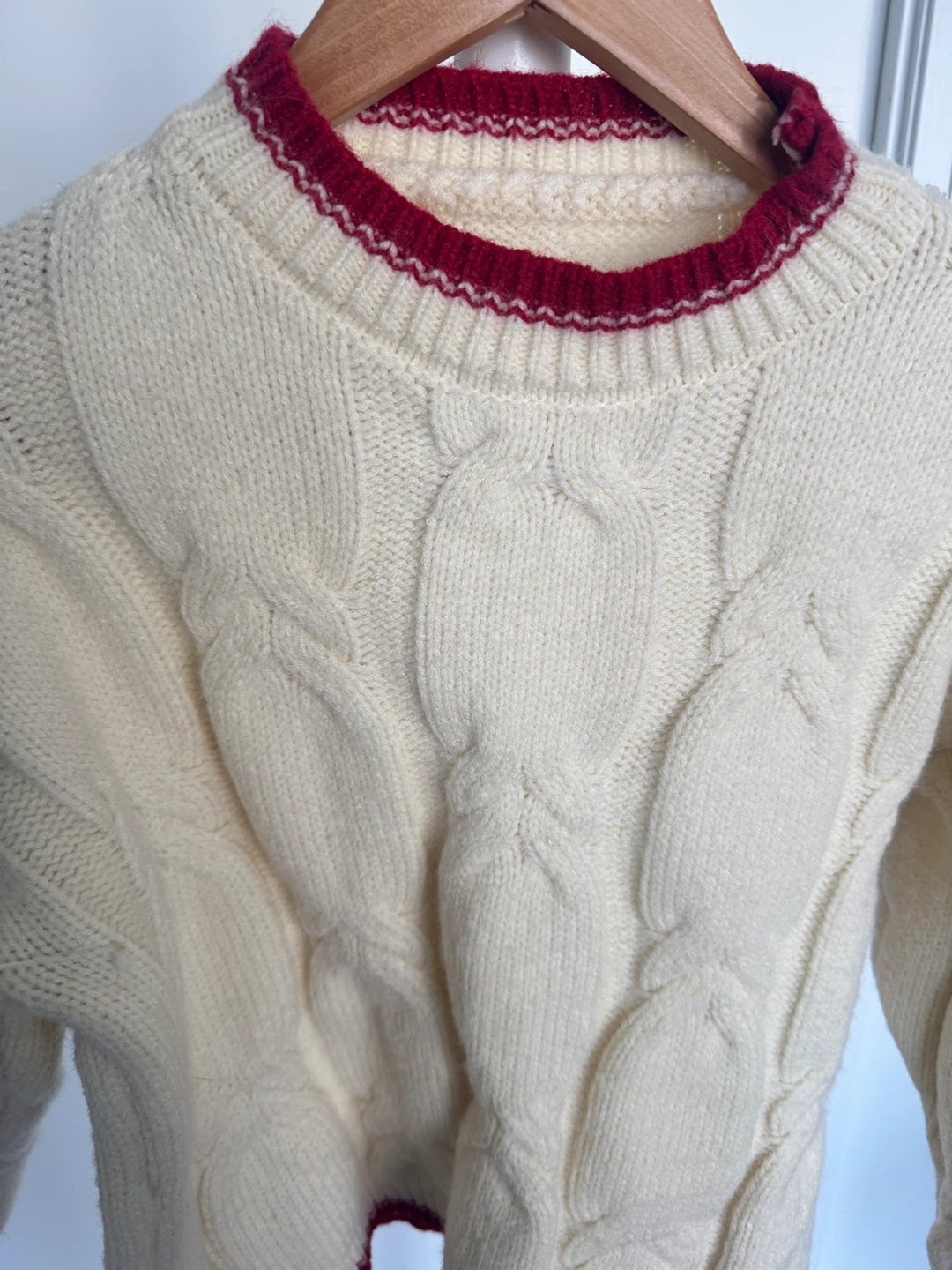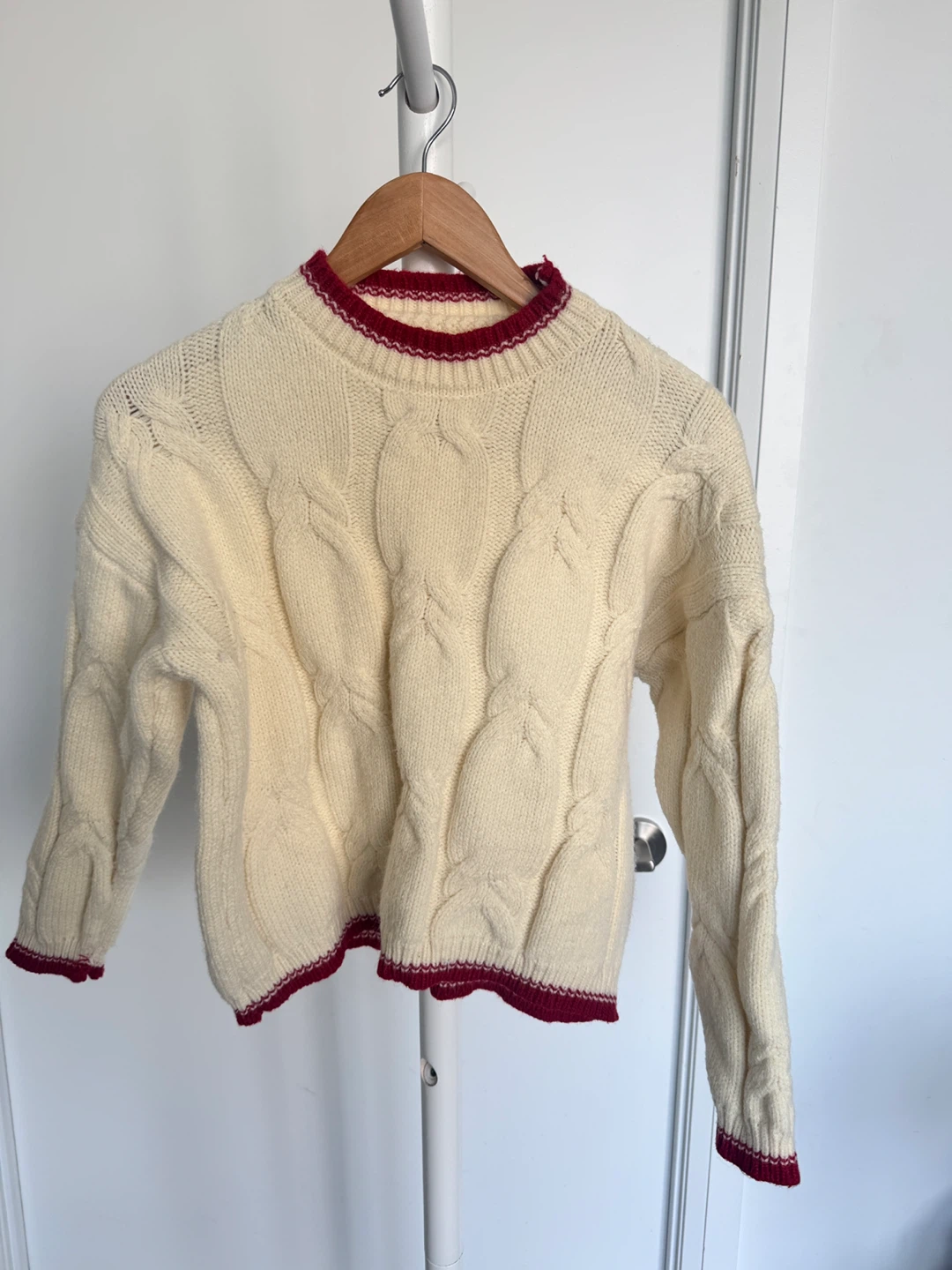 A cozy cable knit sweater in a cream colour with red trim. It's in great condition and perfect for the cooler weather! The material feels soft and comfortable.