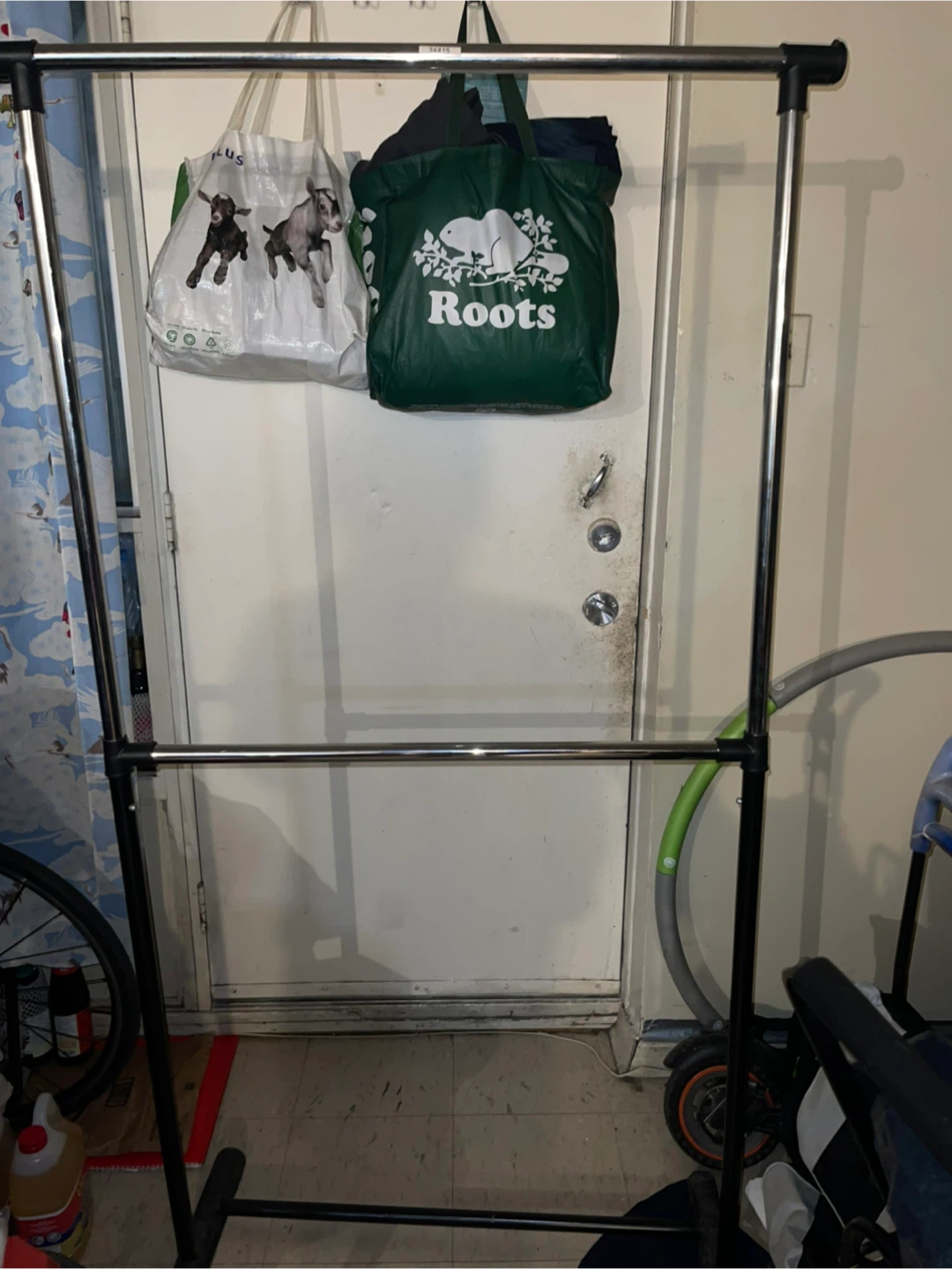 I'm selling an adjustable clothes rack. NO wheels. It's in good condition and ready to hold your clothes!