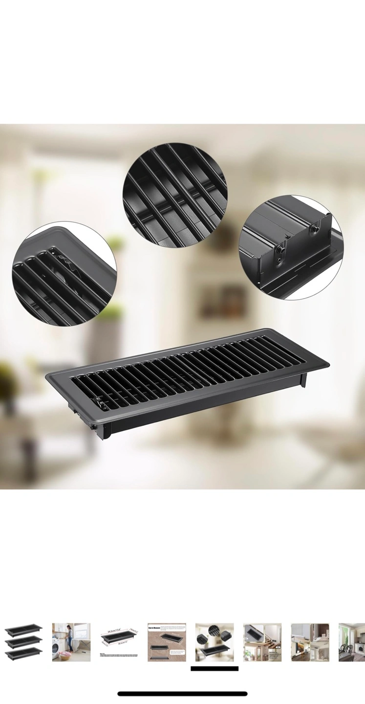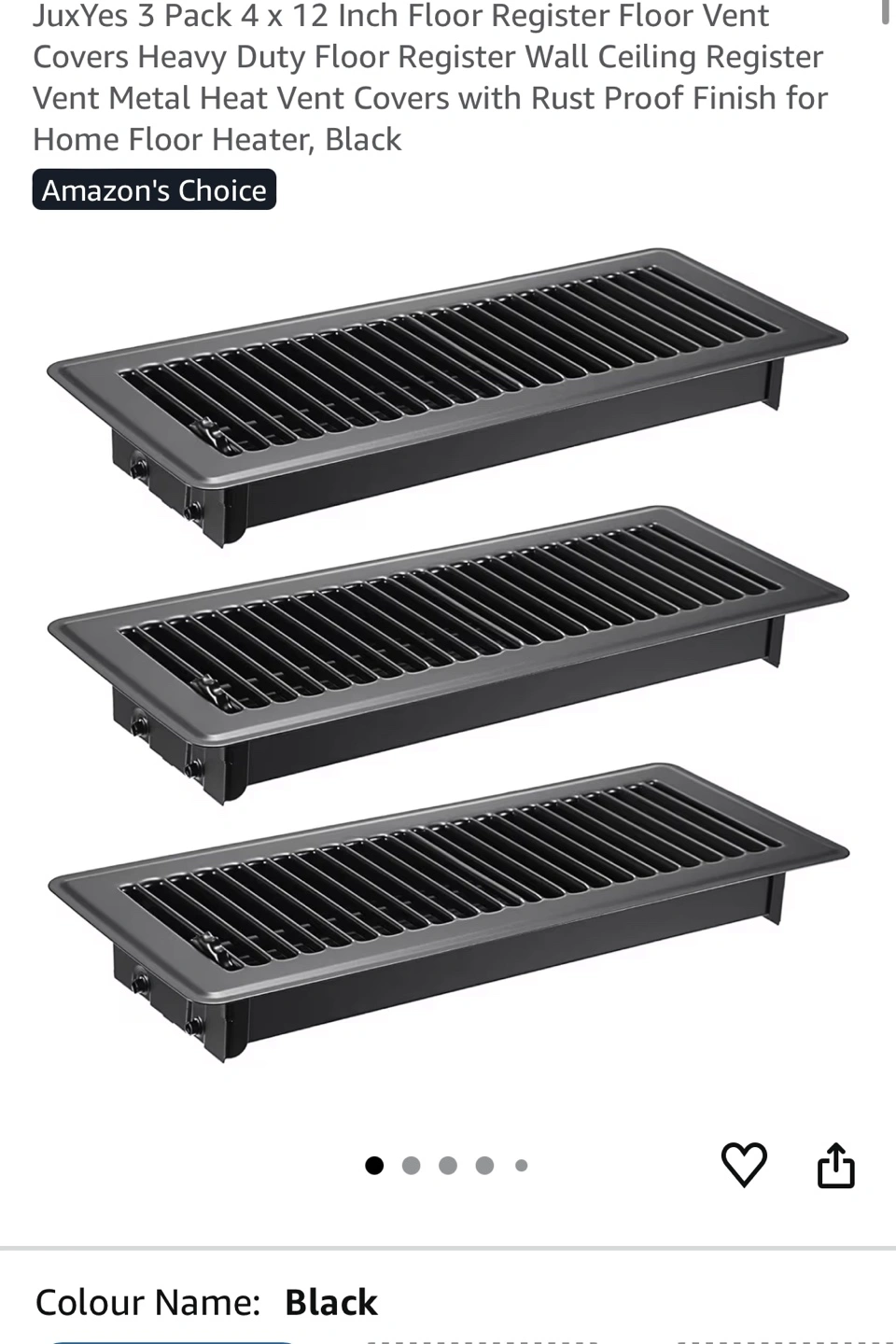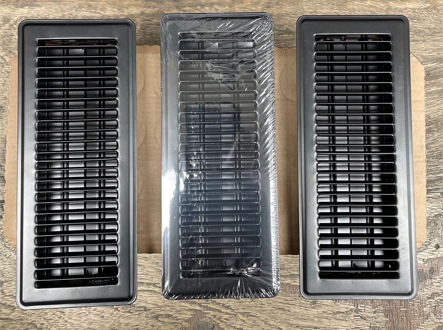 Selling a set of three JuxYes floor register vent covers. They are heavy-duty and finished in black. Each vent cover measures 4 x 12 inches. Great for home floor heaters!