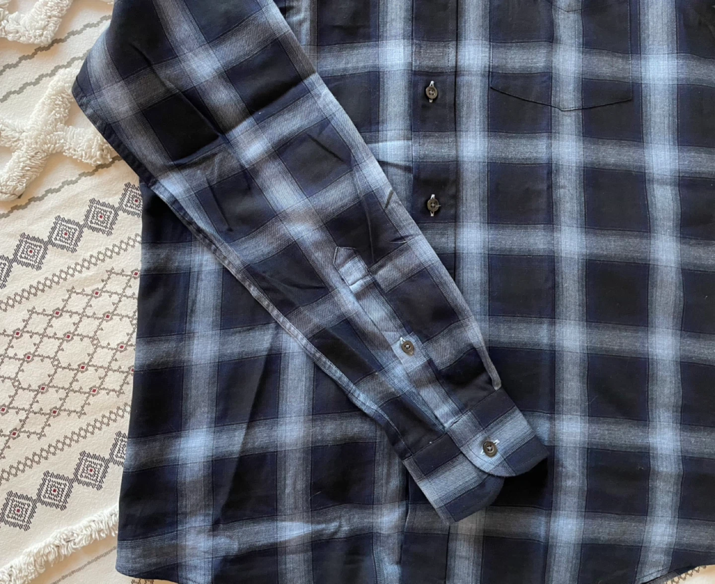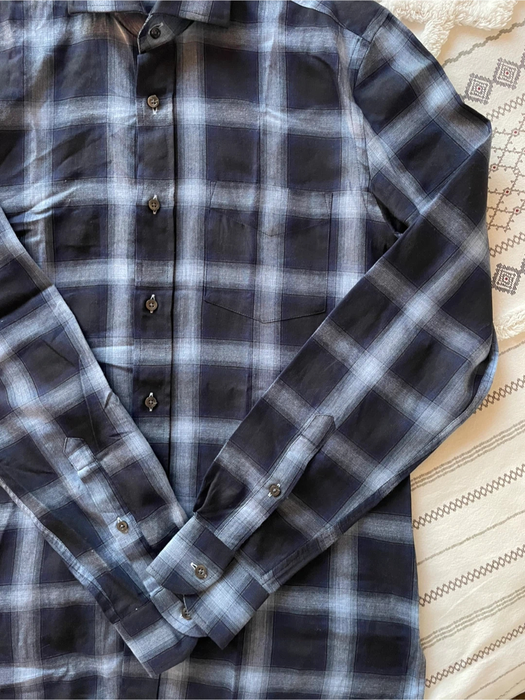 REISS button-up shirt in a stylish plaid pattern. Size small. Brand new, never worn. It was a gift but my partner does not reach for it.