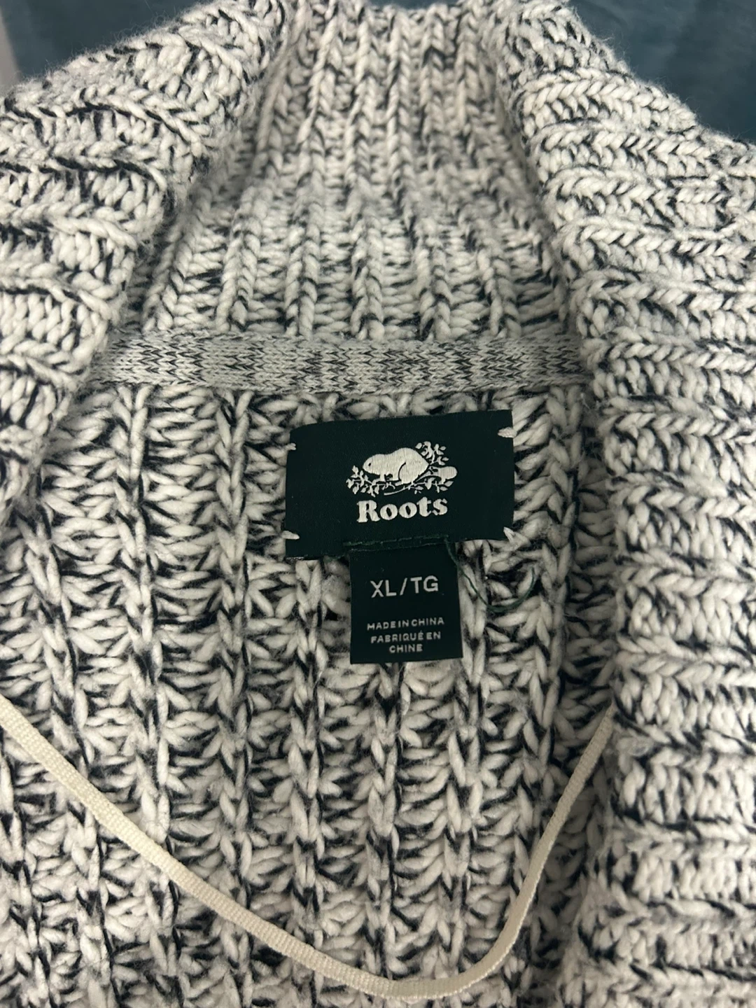 Cozy up in this Roots cardigan! It's a salt and pepper colour, and a size XXL. Perfect for layering on chilly days!