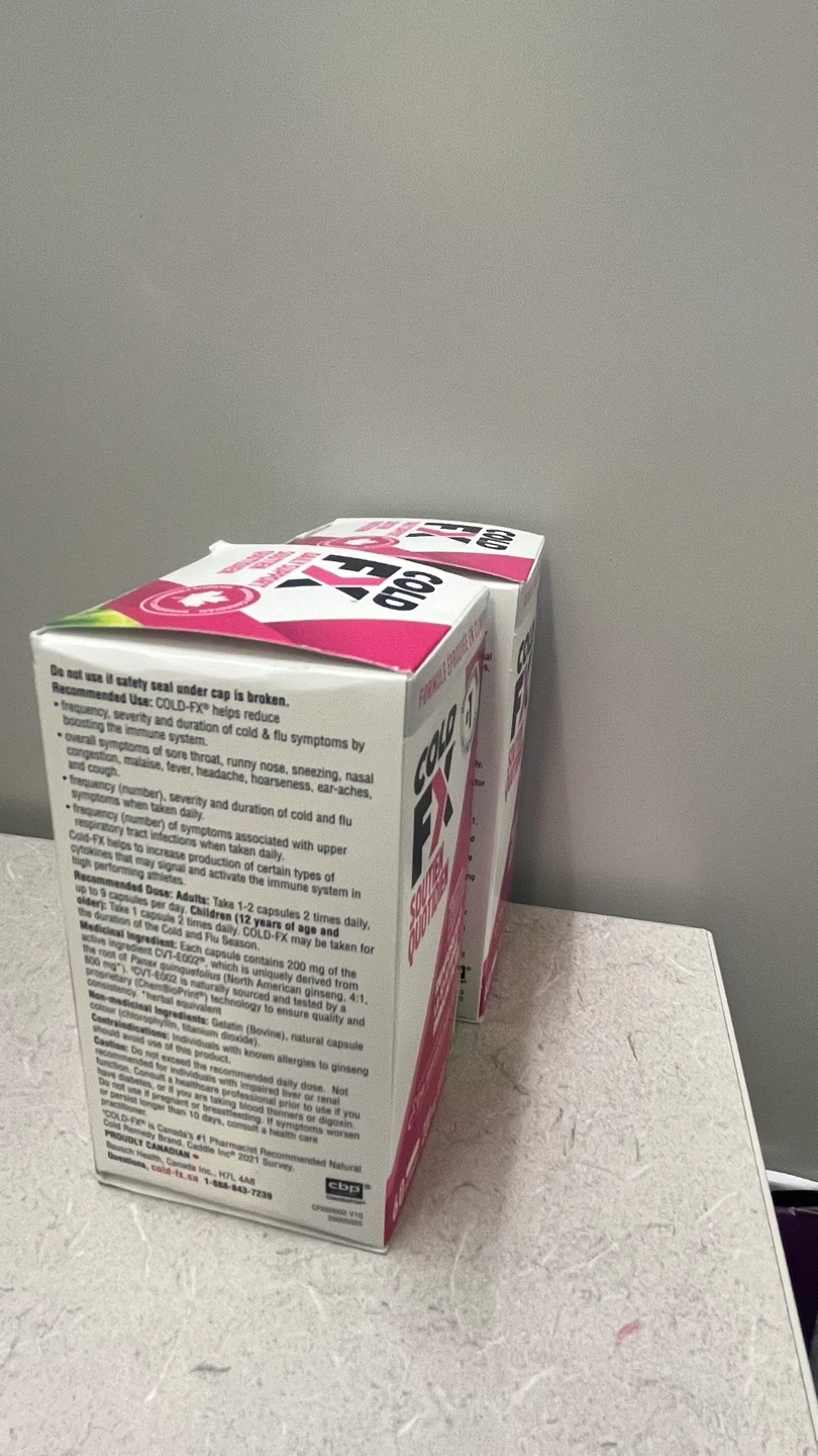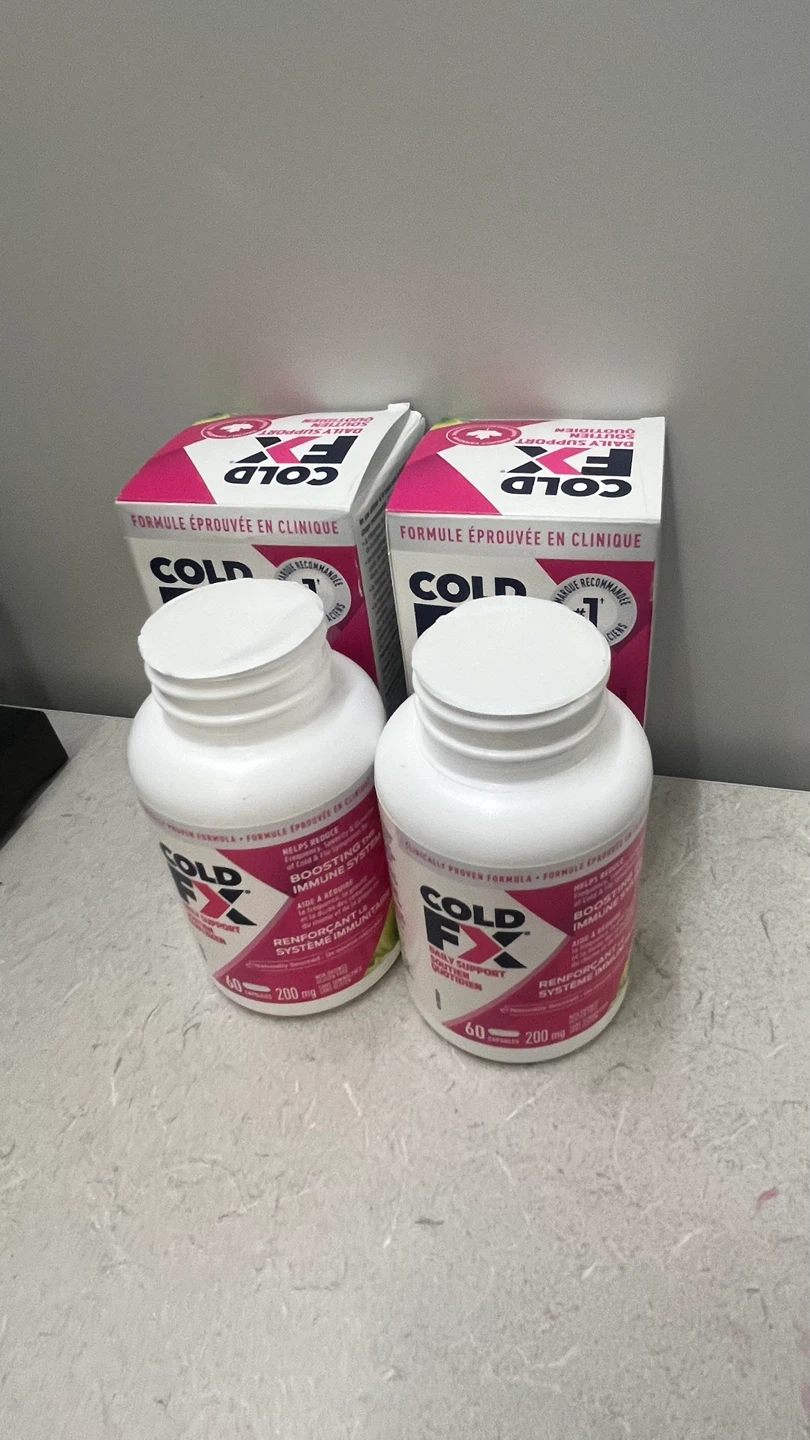 2 boxes of Cold FX Daily Support capsules, each containing 60 capsules to help boost your immune system, reduce the frequency, severity, and duration of cold and flu symptoms. These boxes are brand new and sealed.