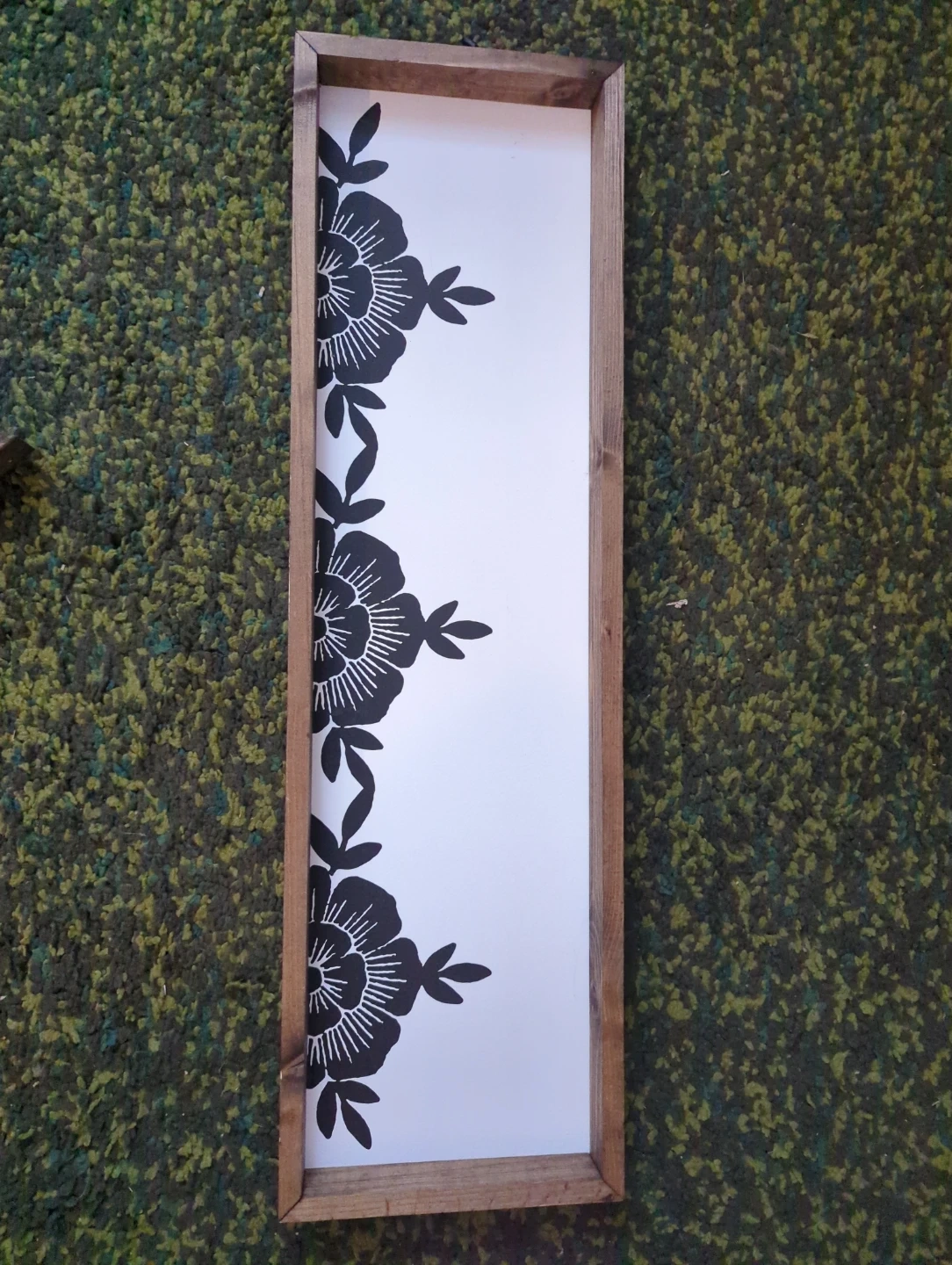 I have two pieces of floral wall art for sale. One is a rectangular piece and the other is a diamond shape. Both have a wooden frame and a floral design on a white background. They're perfect for adding a touch of nature to any room!