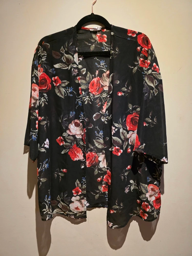 Selling a lovely floral print kimono! It's a lightweight, flowy piece perfect for layering. The black background with red and white roses makes it a versatile addition to any wardrobe. It's a one-size-fits-all style, so it's comfy and easy to wear