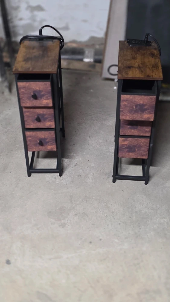 Selling a set of two bedside tables. They feature a brown wood top and drawers, with a black metal frame. Great for adding a touch of rustic charm to your bedroom!