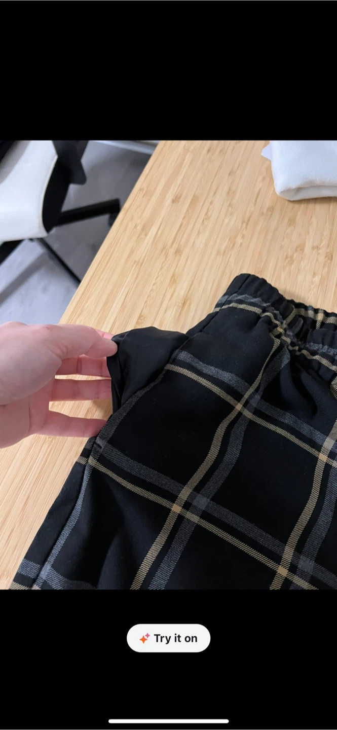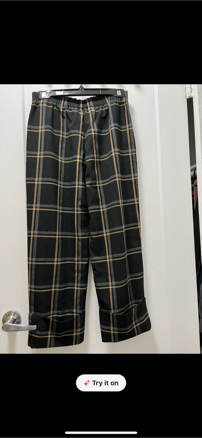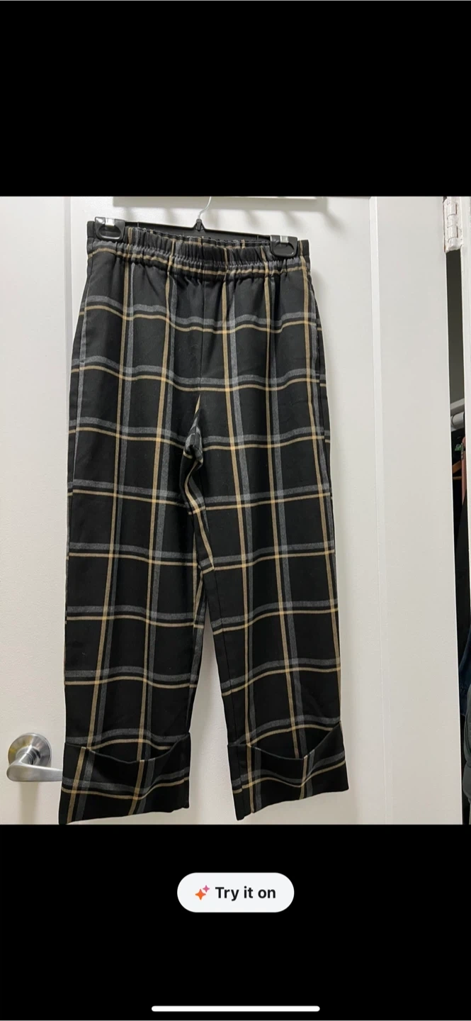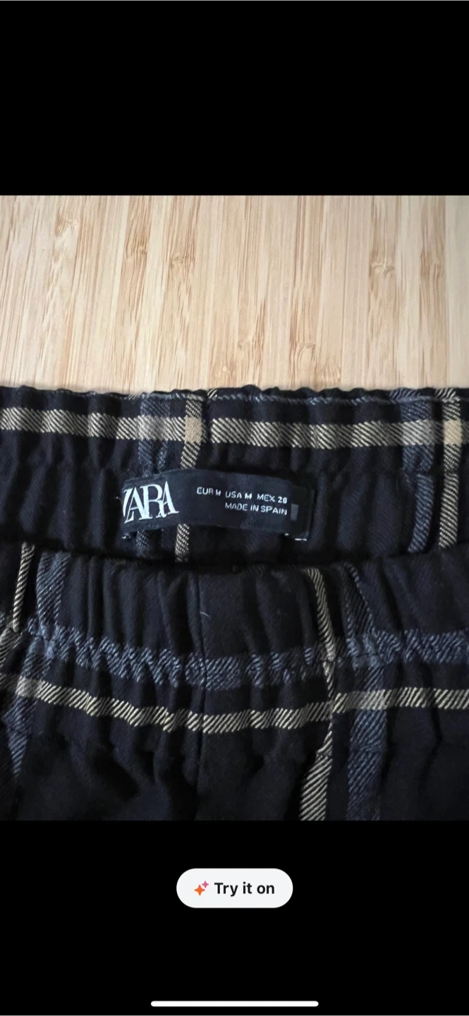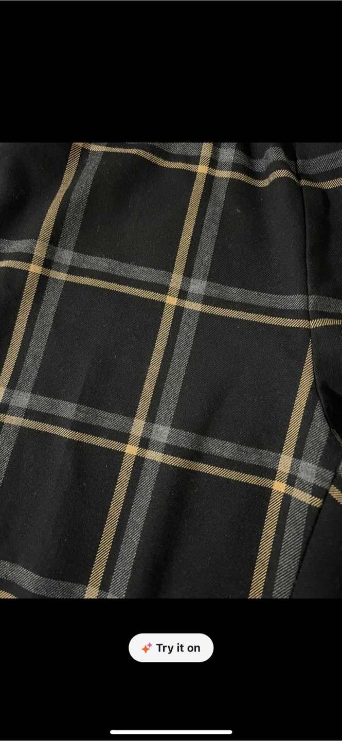 Here are some Zara plaid pants in a size medium! They're in great condition, not worn at all. The pants feature a stylish plaid pattern in black, grey, and gold tones. Perfect for adding a touch of sophistication to your wardrobe!