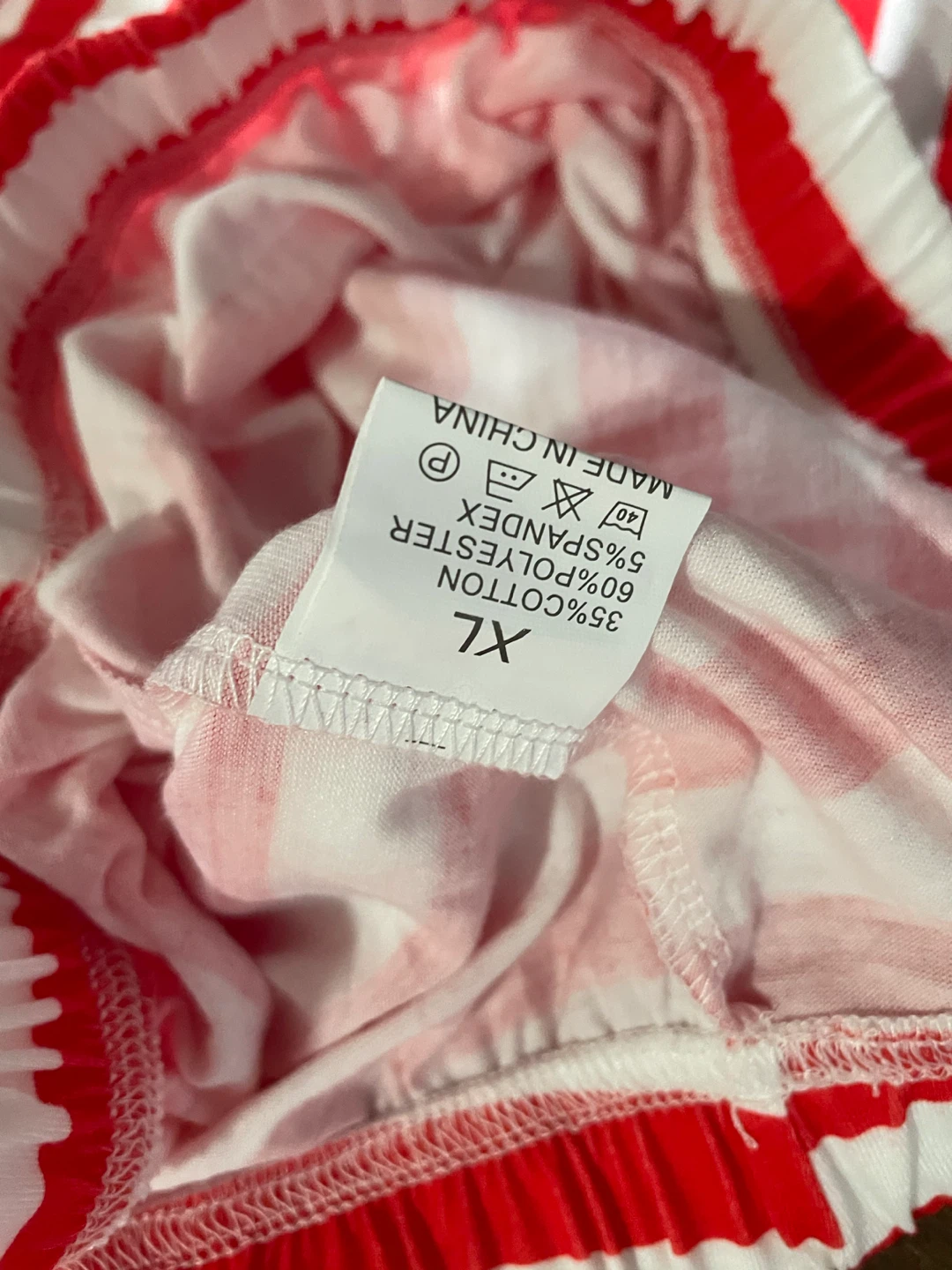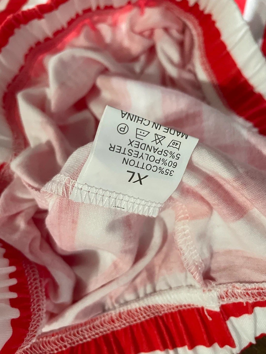 Get ready for the holidays with this fun Grinch pajama set! It's an XL and made of 35% cotton, 60% polyester, and 5% spandex. The set features a red and white striped pattern with a Grinch design on the top. Perfect for lounging around the house during the festive season