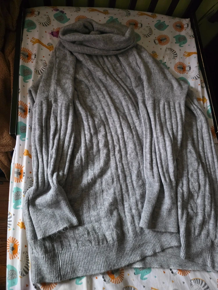 Selling a cozy grey knit turtleneck sweater dress! It's perfect for staying warm and stylish during the colder months. The soft knit material makes it super comfortable to wear, and the turtleneck adds a touch of elegance