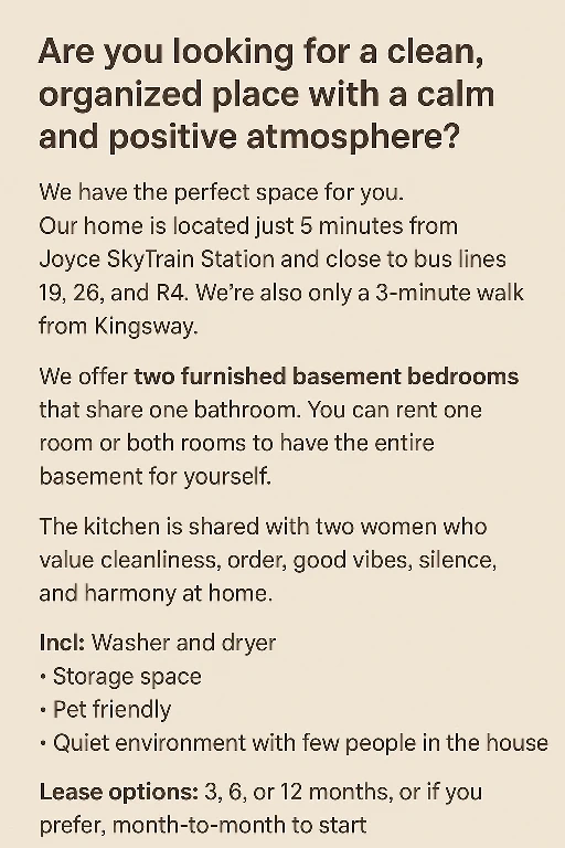 Looking for a clean and organized place with a calm and positive atmosphere? This furnished basement bedroom is located just 5 minutes from Joyce Skytrain Station and close to bus lines 19, 26, and R4, and a 3-minute walk from Kingsway.