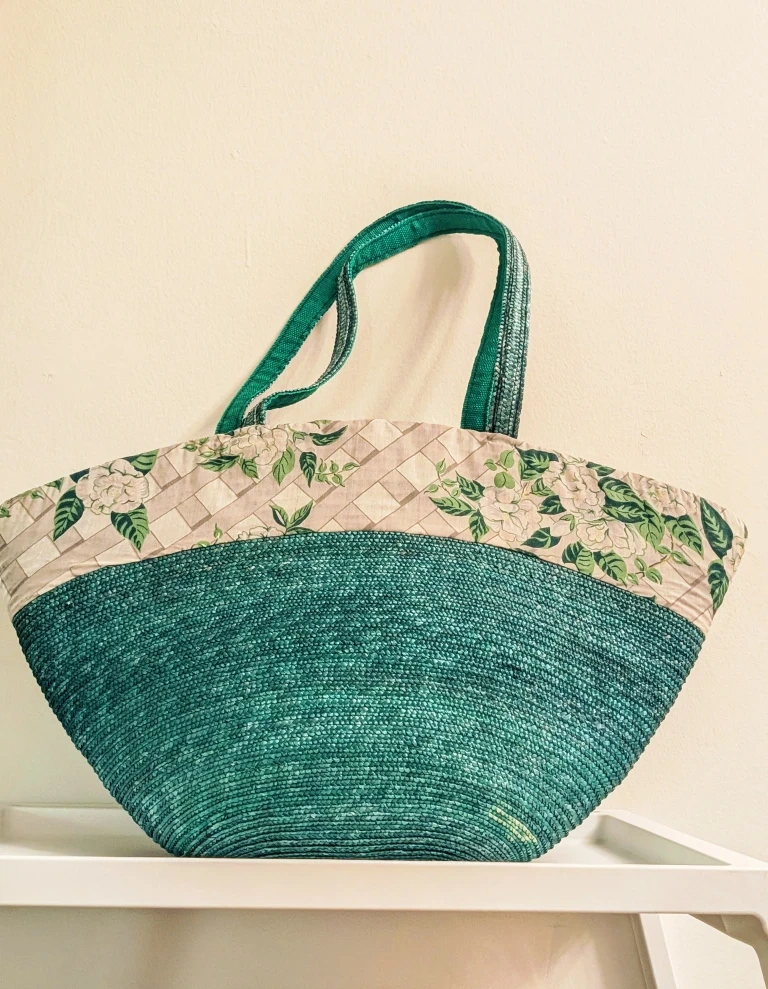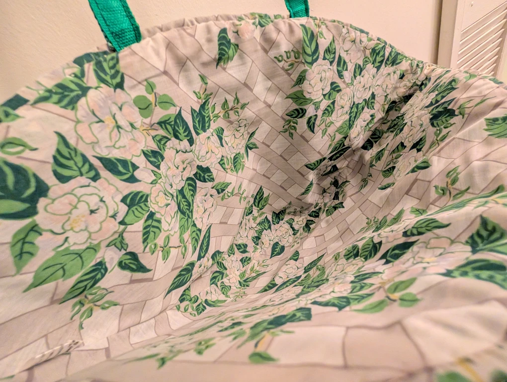 This is a cute tote bag with a floral pattern on the top half and a woven green texture on the bottom. It has green handles and is in good condition!
