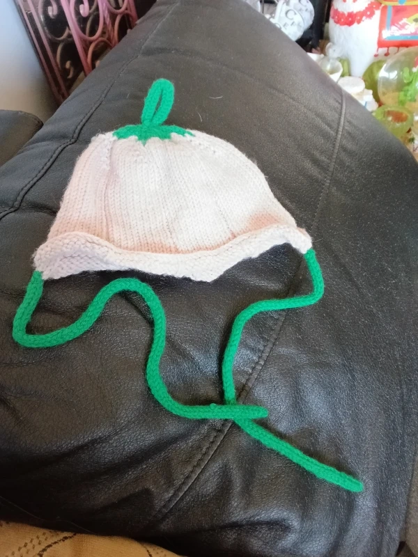 Check out this adorable handmade knitted baby hat! It's in great condition and perfect for keeping your little one warm and stylish. The hat features a cute design with green accents, making it a unique and charming addition to any baby's wardrobe