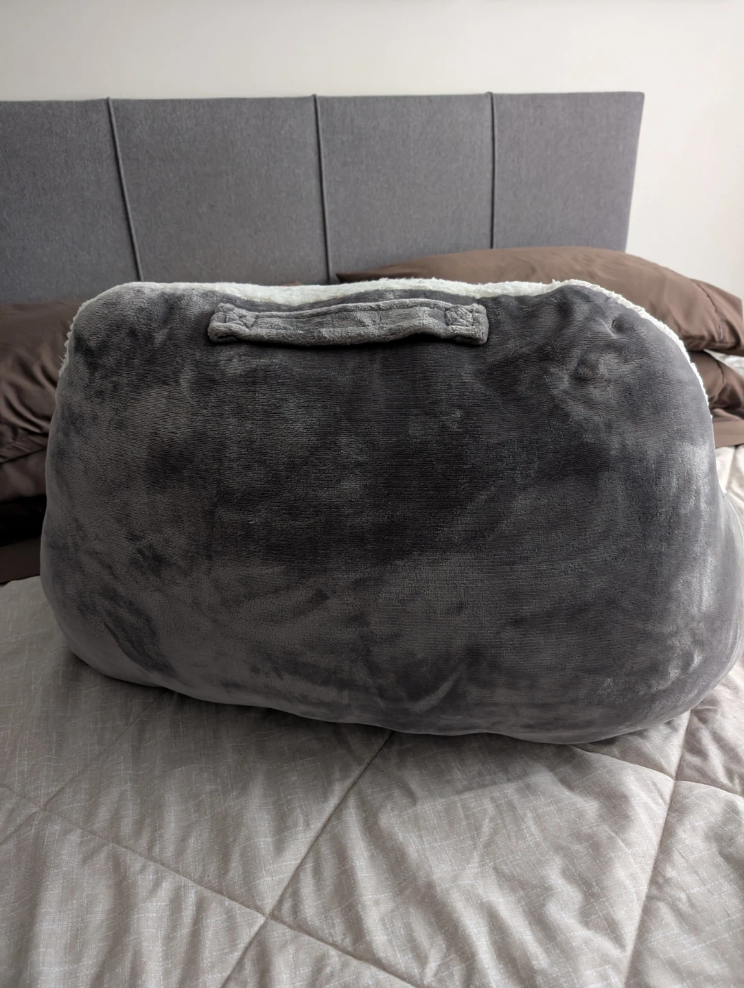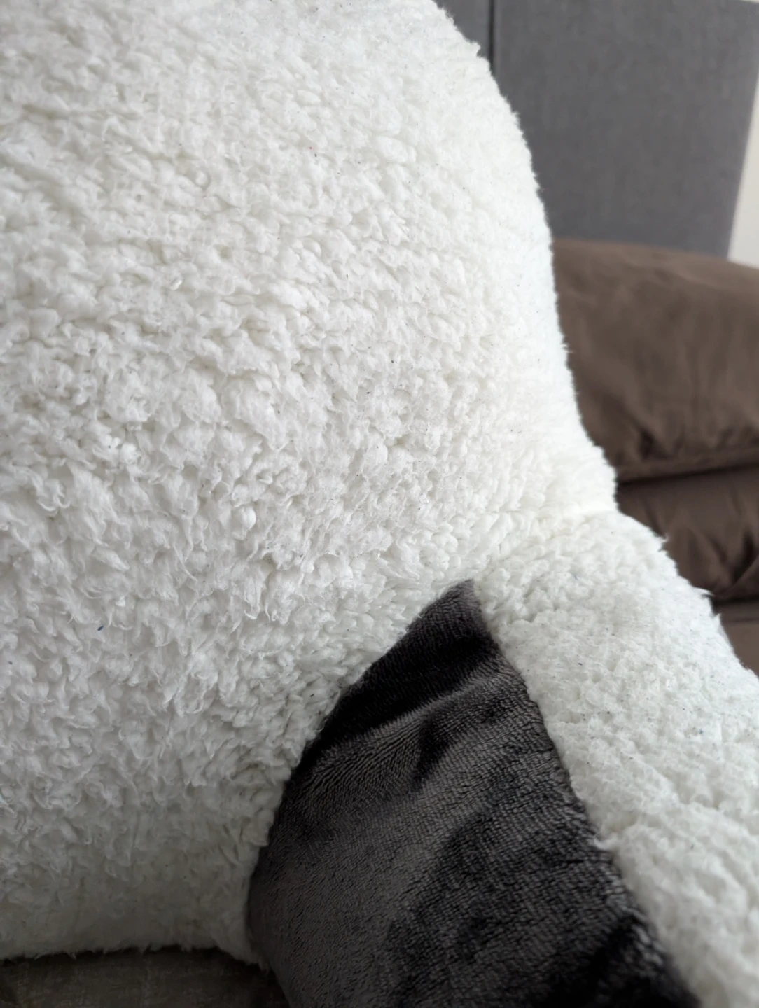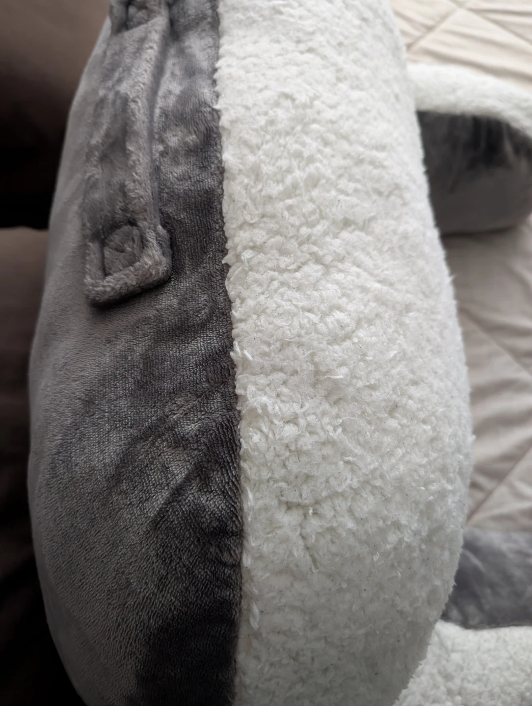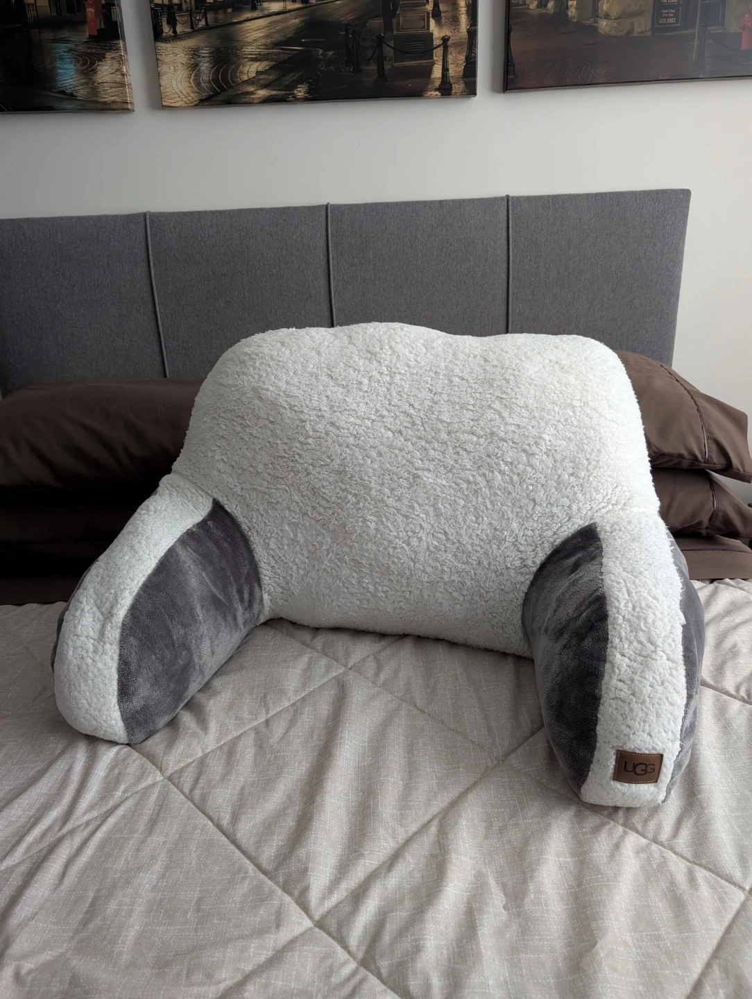 Cozy UGG bedrest/backrest pillow. It's a sherpa and microplush material, perfect for reading in bed or lounging around. The colour is a soft white and grey. Clean, no stains.
