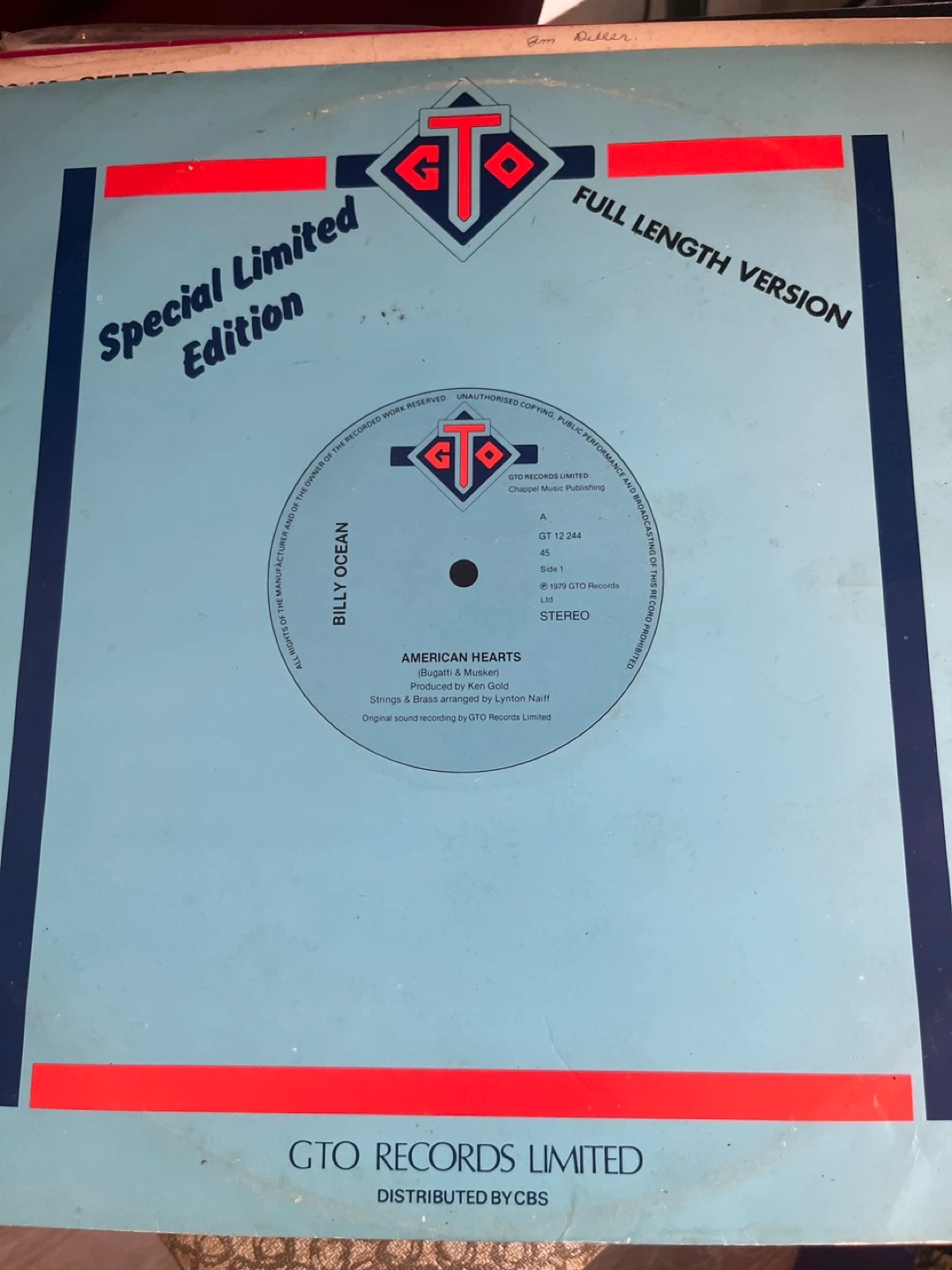 Selling a Billy Ocean LP, titled American Hearts. It's a full-length version, a special limited edition released by GTO Records Limited. The record includes the songs 'American Hearts' and 'My Love'.