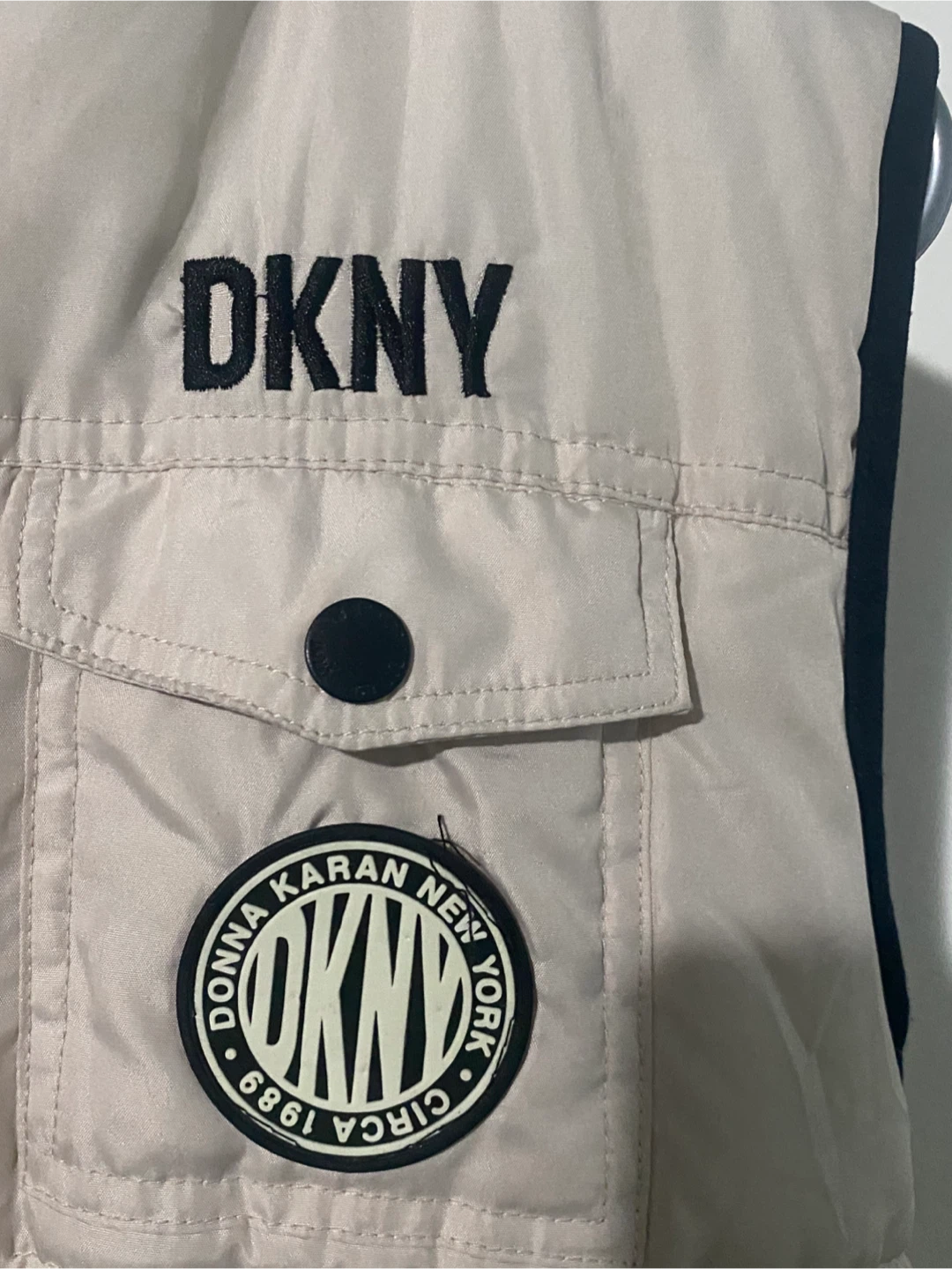 Here's a DKNY puffer vest! It's a cream colour with black accents and has a hood. Perfect for layering on those chilly days.