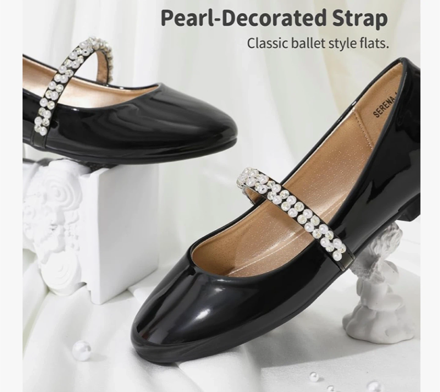 These adorable Serena-100 ballet flats are perfect for your little one! They feature a classic ballet style with a pearl-decorated strap. The outsole has a floral print and is slip-resistant, ensuring stable footing. Size 5