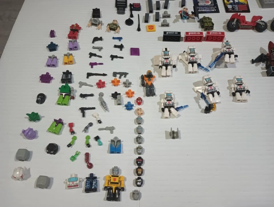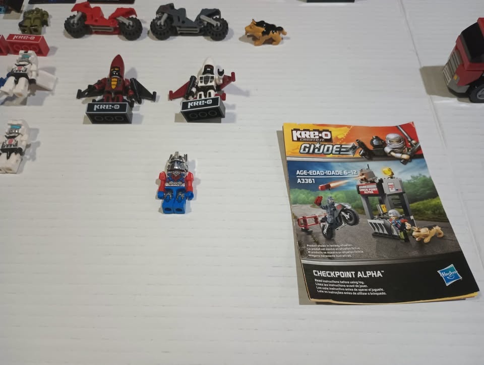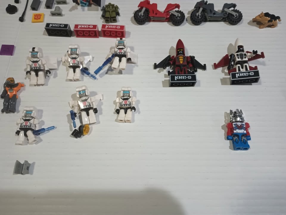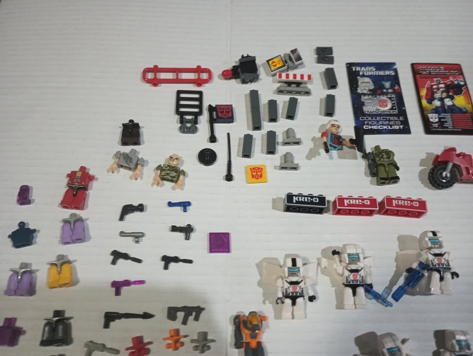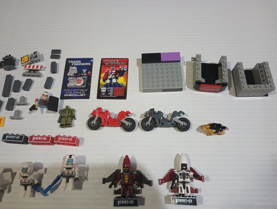 Lot of various Kre-O Transformers Kreon Micro Changers G.I Joe and Other Kre-O Figures and pieces. Lot of 6 Kre-O Transformers Kreon Micro Changers Autobot Trooper Cycle Chase set figures, Ramjet, Thrust and other Kreo figure parts and pieces inluding some pieces and manual (not complete, missing a couple figure and other pieces) from a GI Joe set, a Kre-o Optimus Prime 2 in 1 set #31143 with manual and lots of other Kre-O transformer and other Kre-O figure body parts, accessories and pieces. From a SF/BF home in Charleswood.
