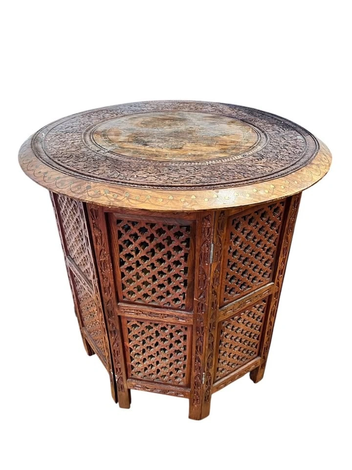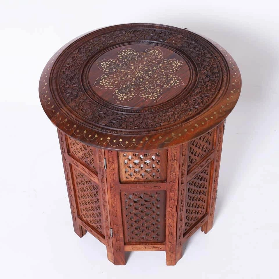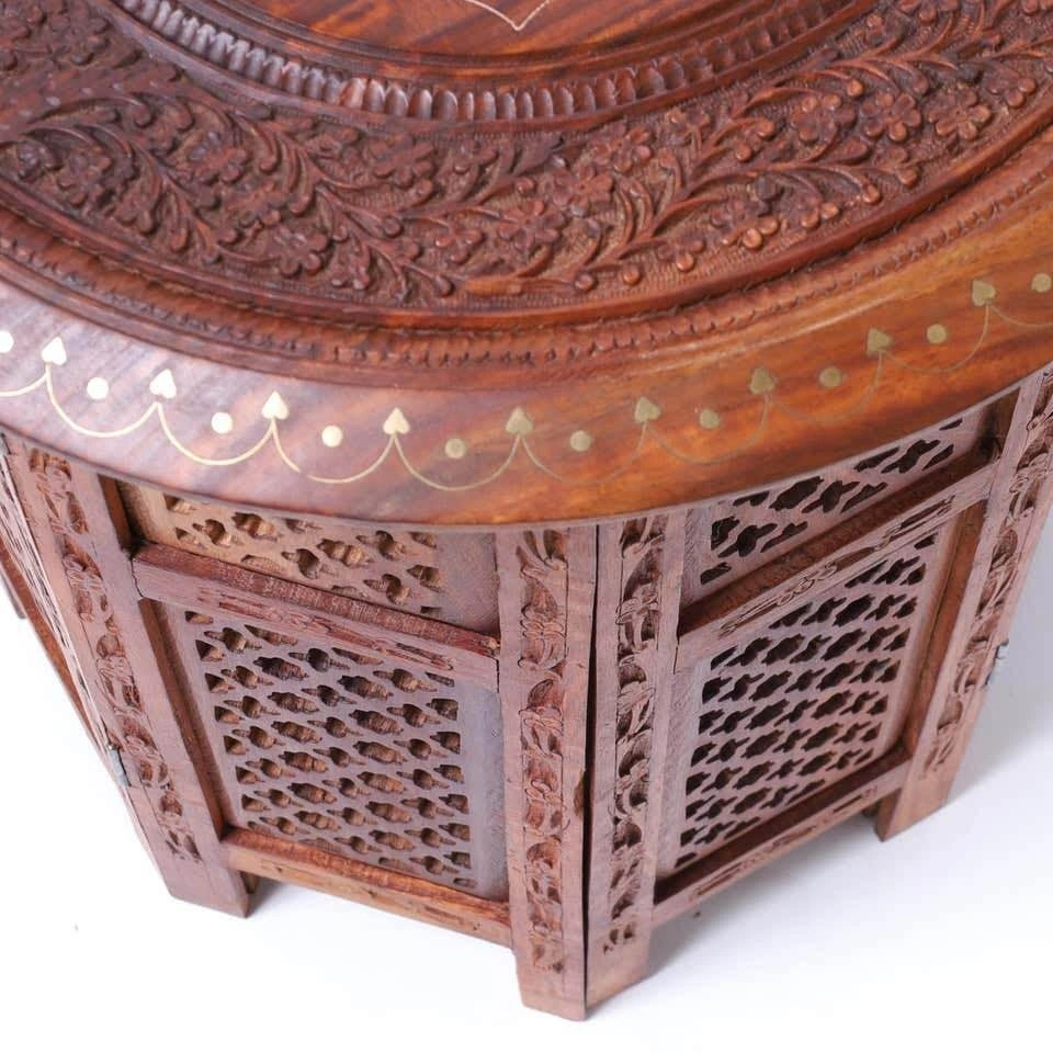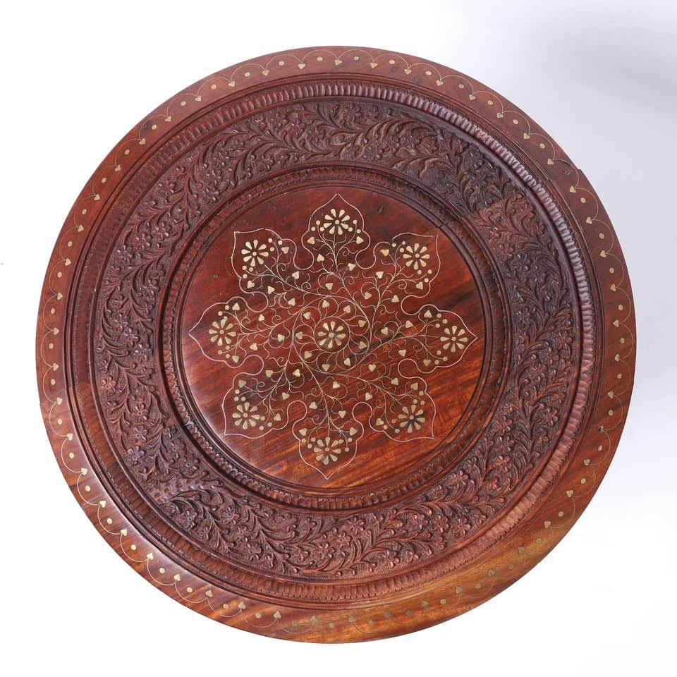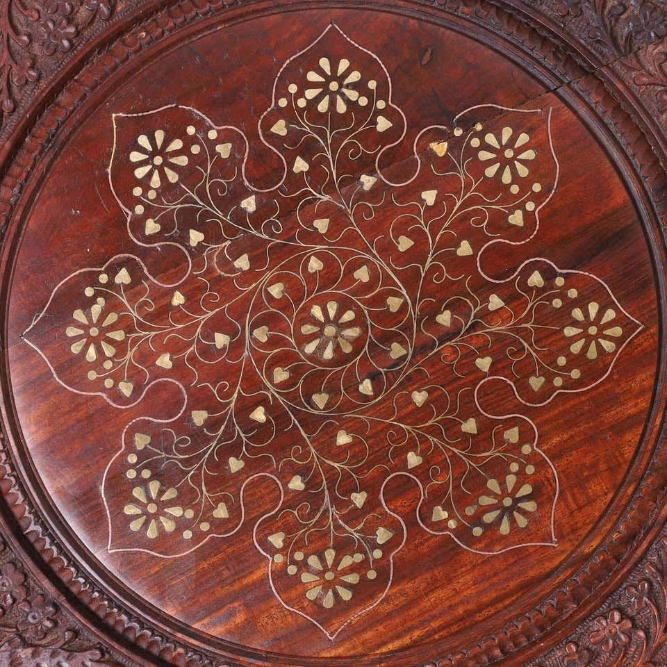 Selling 1 vintage Anglo Indian table stand. Crafted in teak wood with round tops with brass inlays and floral carvings over an octagon form base with open fretwork.
