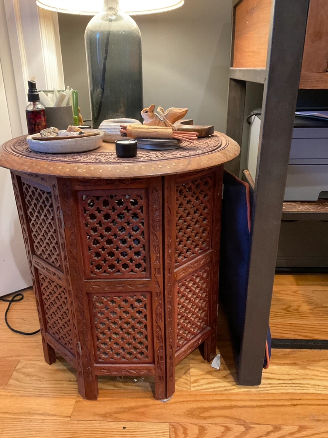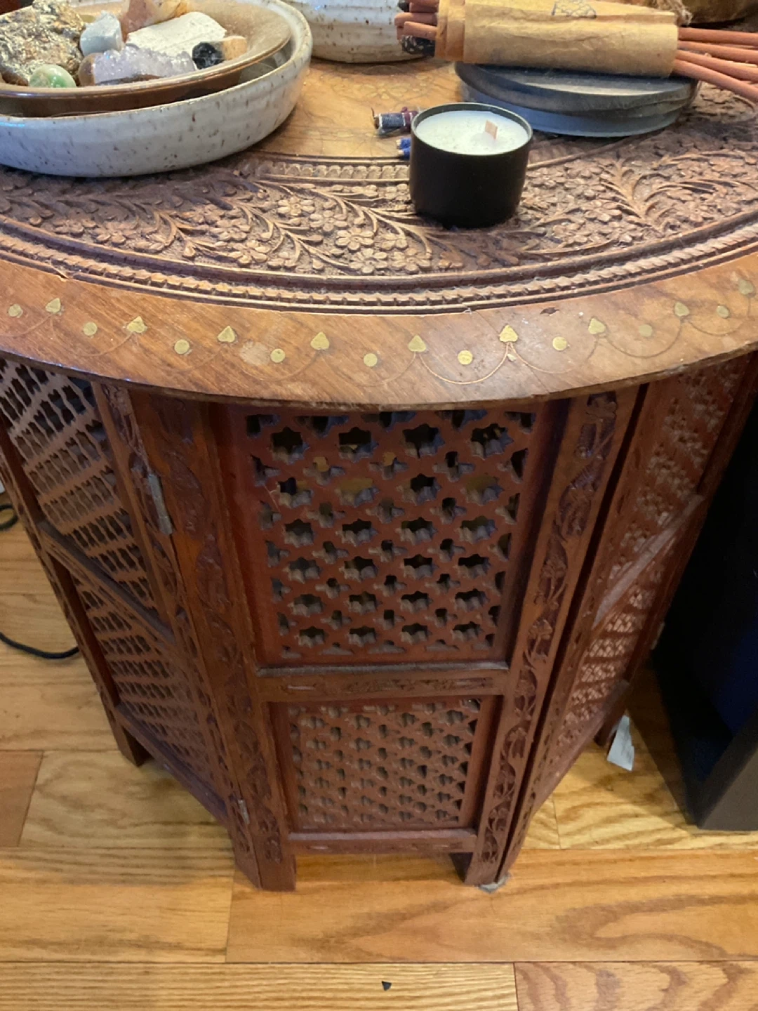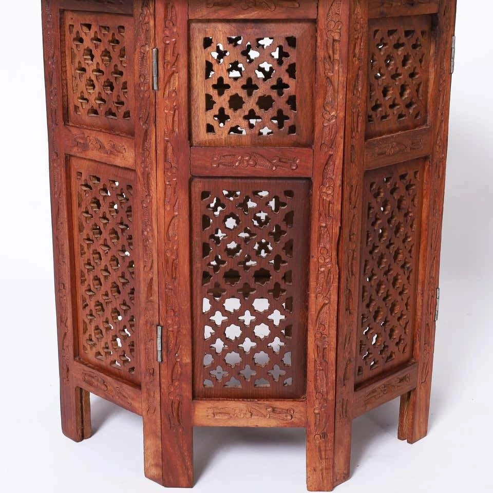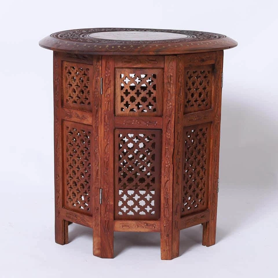Selling 1 vintage Anglo Indian table stand. Crafted in teak wood with round tops with brass inlays and floral carvings over an octagon form base with open fretwork.