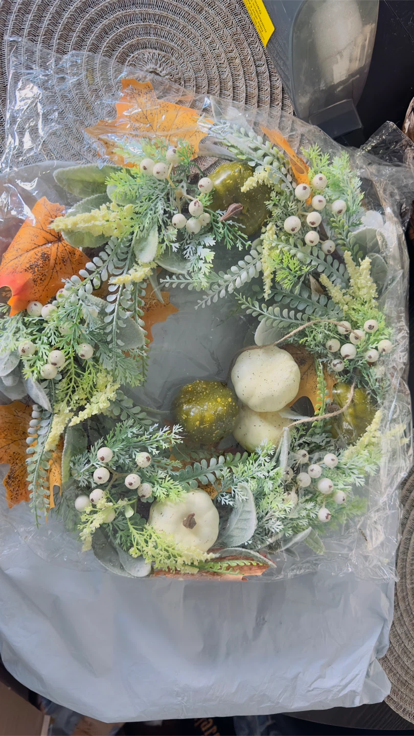 Beautiful fall wreath! It's decorated with pumpkins and leaves, perfect for adding a touch of autumn to your home. It's in great condition and ready to be displayed