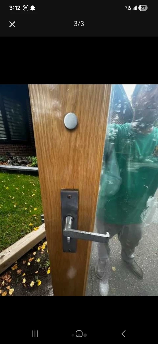 This is a solid wood door with glass panes, perfect for adding a touch of elegance to any room. The door is in great condition, has a sturdy frame, and will provide years of reliable service. I'd the measurements to be 3 feet wide by 81 inches tall, a standard
