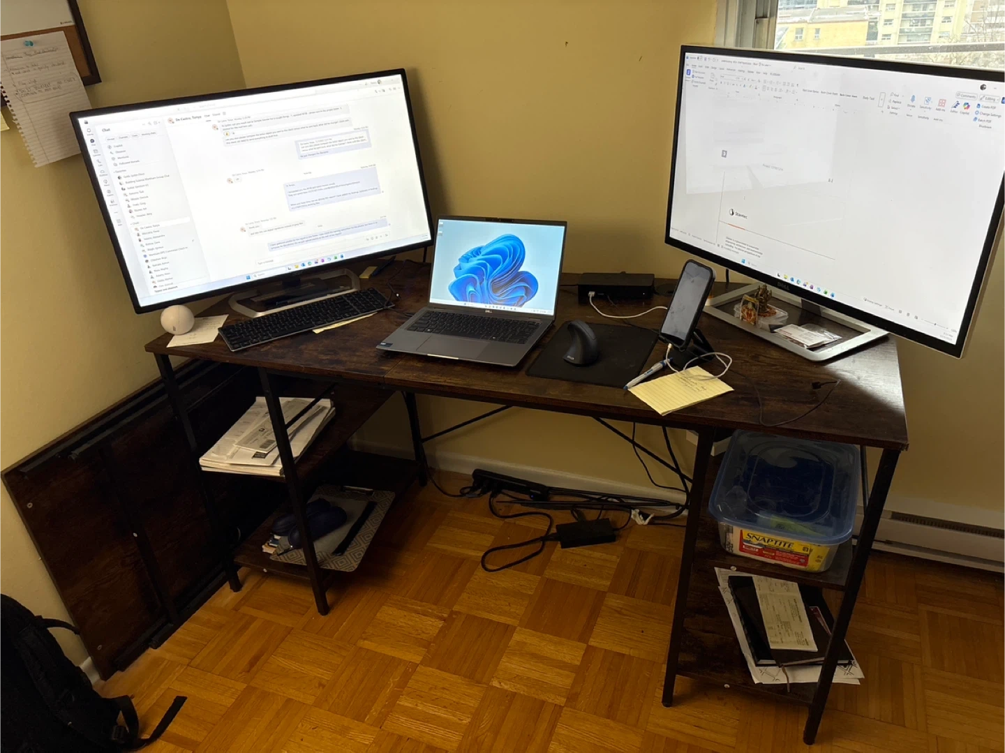 Selling a Bestier L-shaped corner desk in great condition! It's perfect for a home office setup. I bought this for $199.99. This desk offers ample workspace and storage with its shelves.
