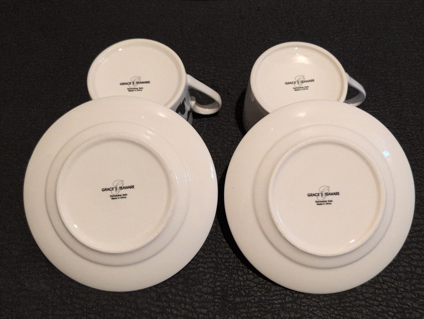 Selling a set of Grace's Teaware cups and saucers. The set includes two cups and two saucers, each with a unique design. One set has a butterfly pattern, and the other has a polka dot pattern. They are dishwasher safe.