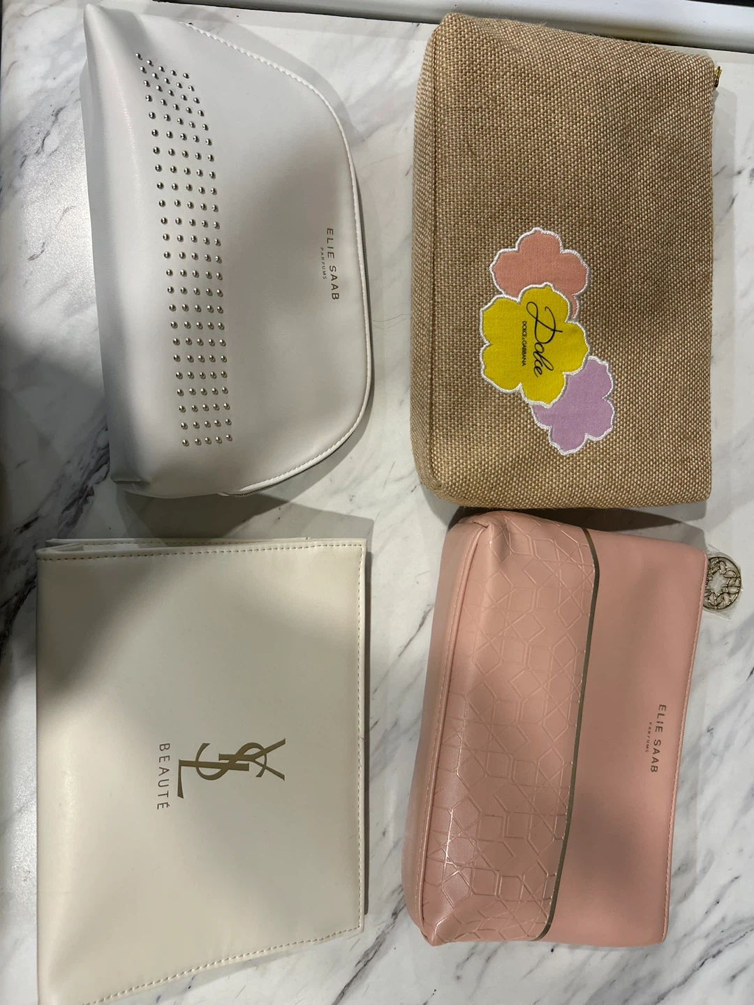 Selling a collection of makeup bags from luxury brands! You'll find a variety of styles and colours from YSL Beauté, Elie Saab Parfums, and Dolce&Gabbana. Perfect for organizing your cosmetics or toiletries!